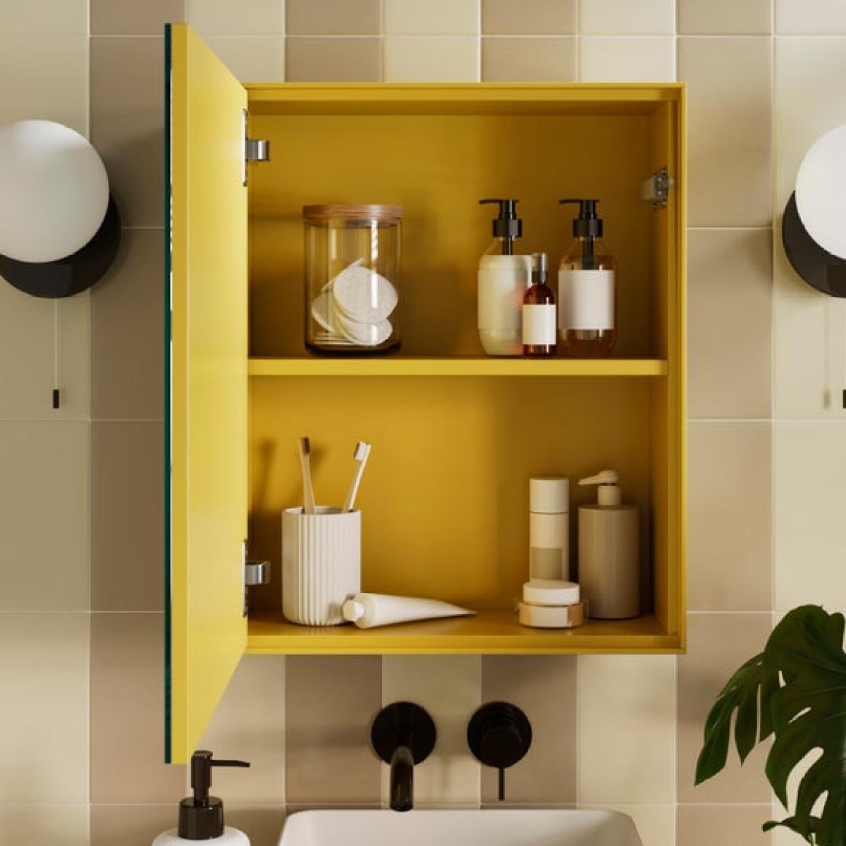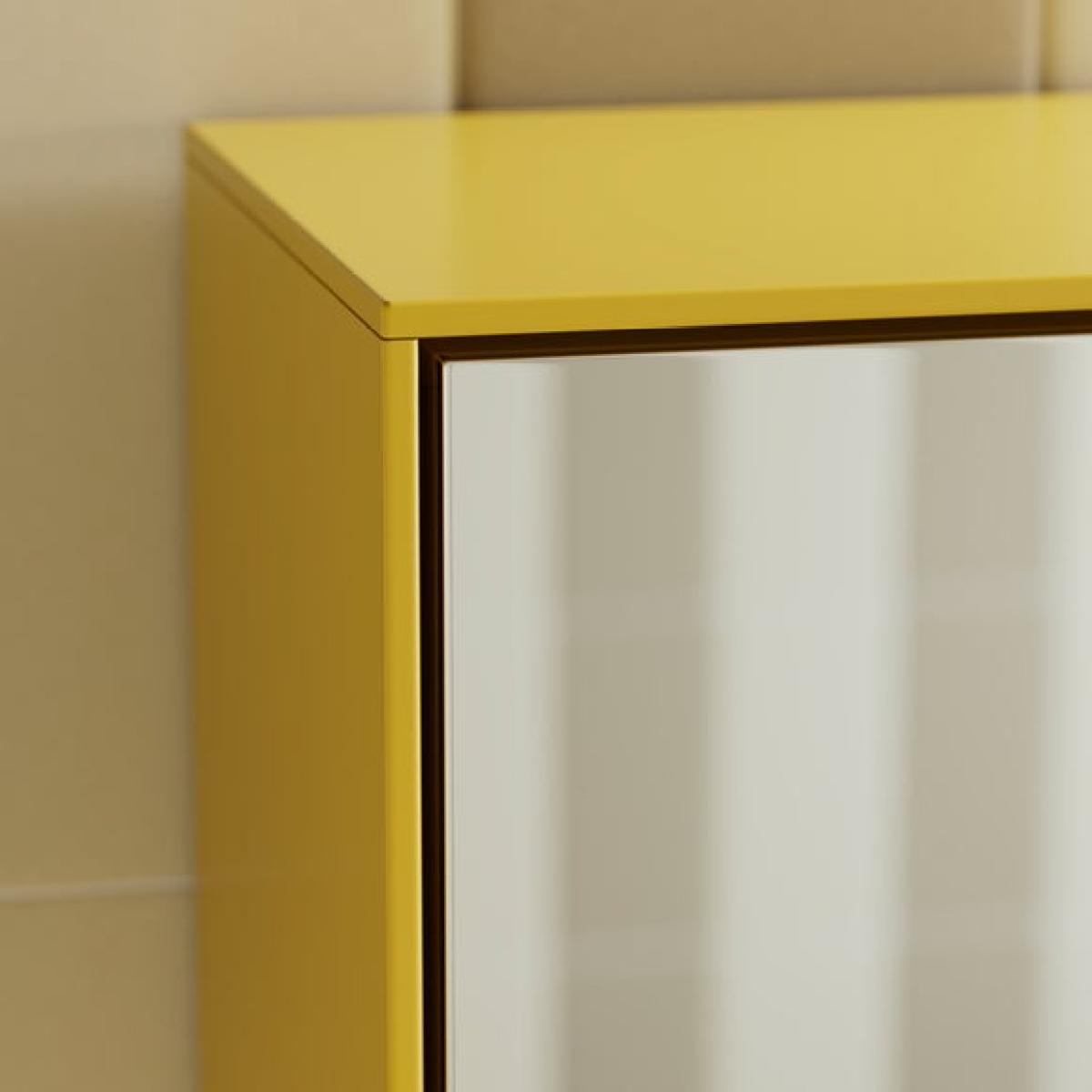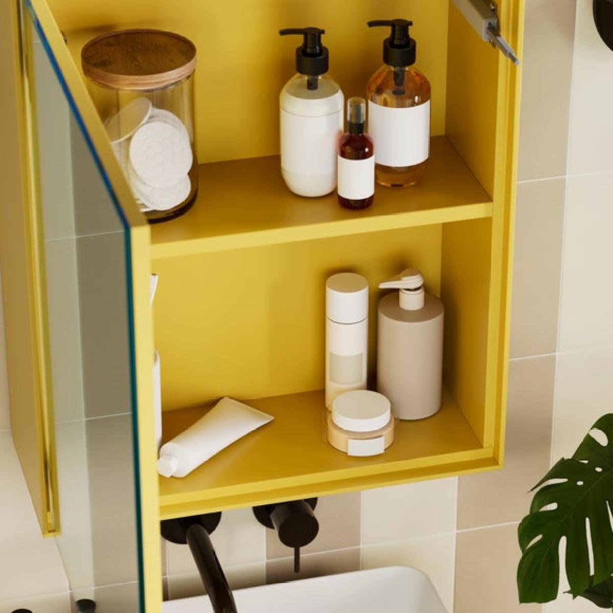 * Modern wall cabinet * Bold colour * Soft closing door Combining reflective function with bold design, this wall-mounted unit features soft-closing doors and a mirrored front. It’s ideal for compact bathrooms or dressing areas, offering concealed storage while enhancing light and space.