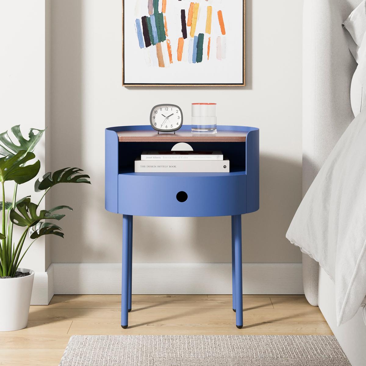 I love this bedside table because of its sleek, compact design and the versatile classic blue colour that works well in both modern and traditional bedrooms. It’s perfect for adding a pop of colour without overwhelming the space. Style-wise, it pairs nicely with neutral tones for a calm look, or can be layered with metallic accessories for a bit of contrast. Practical tips include keeping the top surface clear for a lamp or minimal decor, and using the open space for stacking small books or storing essentials inside if it has a drawer or shelf. Its minimalist style makes it a flexible piece that can adapt across various interior themes, from Scandinavian to contemporary.
