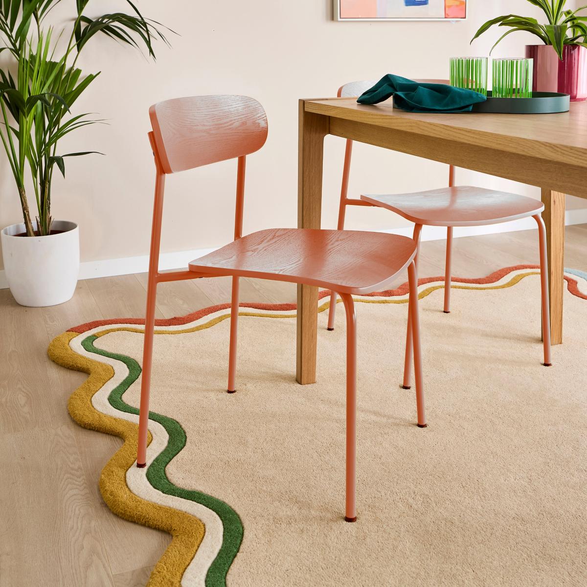 * Ash veneer finish * Stackable * Tubular steel frame Transform your dining experience with this versatile, stackable masterpiece designed to adapt effortlessly to any space or occasion. Carefully crafted, this lightweight chair seamlessly combines functionality with style, making it the perfect choice for both formal dining rooms and casual kitchen settings. This dining chair redefines seating design with its thin tubular steel frame that elegantly follows the chair's entire silhouette, creating a striking visual aesthetic characterised by continuous lines.