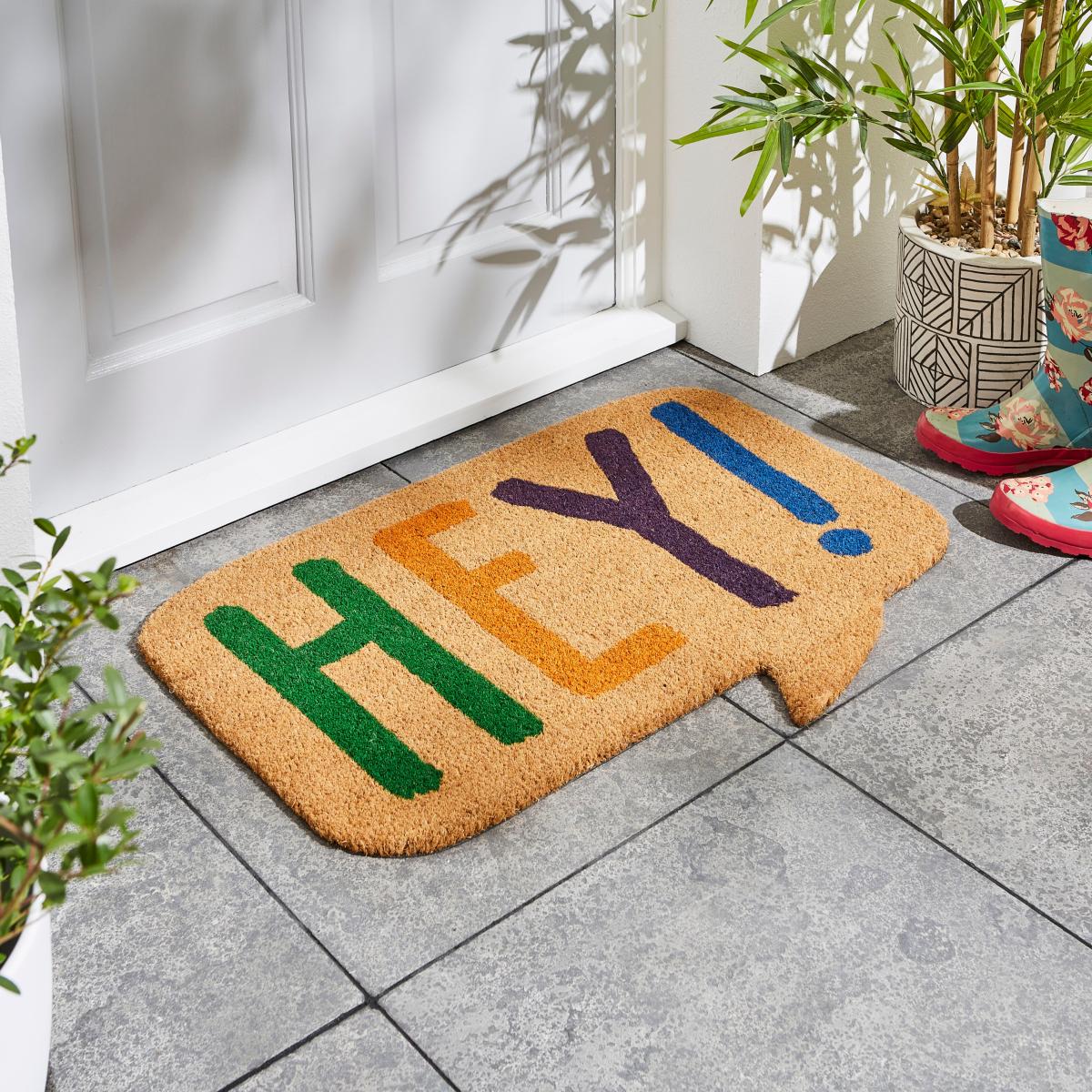 * Made from natural coir* Suitable for outdoor use* Welcoming " Hey!" print* Unique speech bubble shape Welcome your guests to your home with our Elements Hey Coir Outdoor Doormat. Designed with a fun and colourful " Hey!" text, making this the perfect bright welcoming. Made from natural coir with a vinyl backing, this doormat is long-lasting.