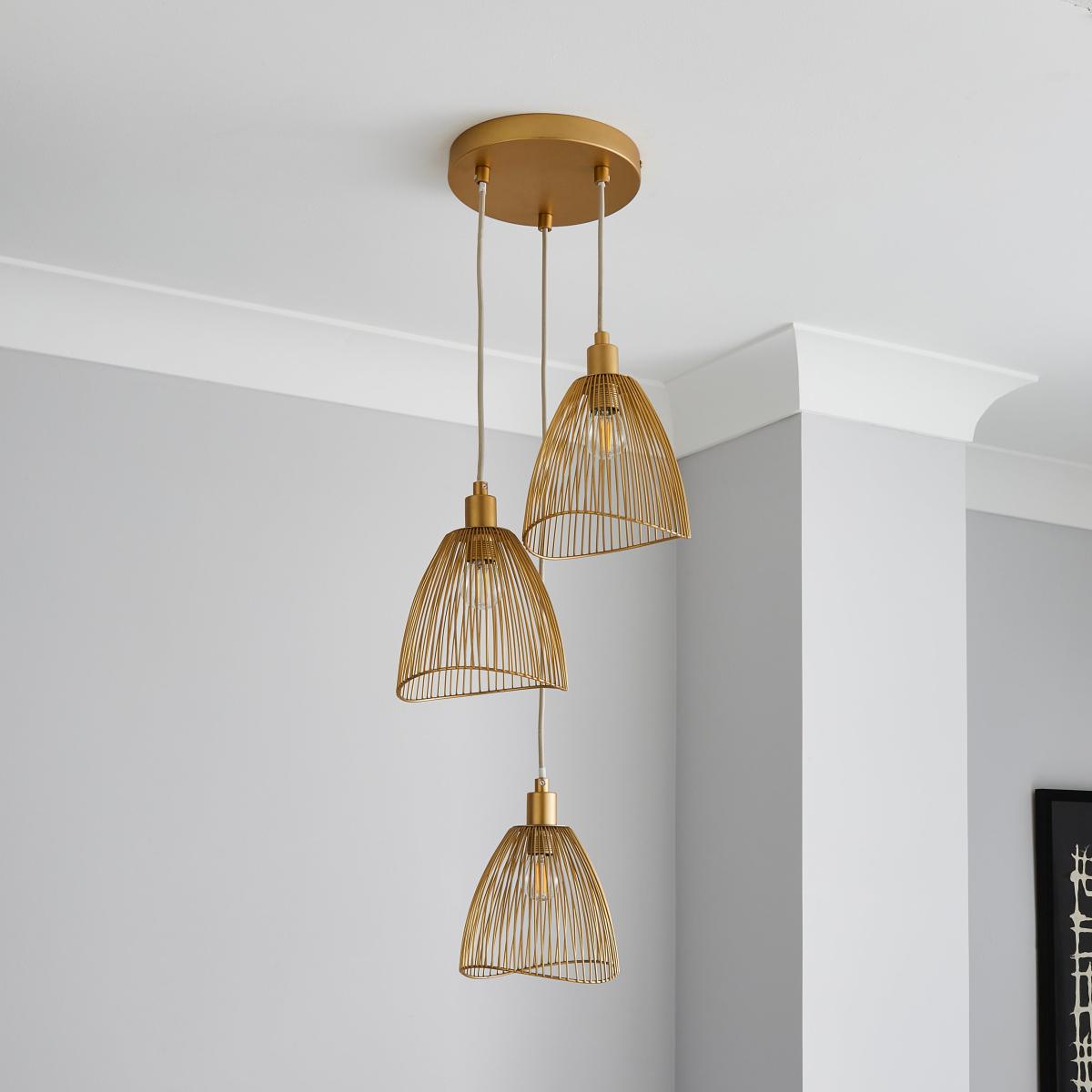 Part of the Elements trend, this stylish Jaula Gold Cluster Ceiling Fitting has a contemporary design that will complement an array of home decors. Featuring a satin gold effect base with three height adjustable gold metal shades, perfect for adding a modern contemporary touch to any room. This piece is dimmable compatible and matching family items are available, helping to coordinate your home to create the dream look.