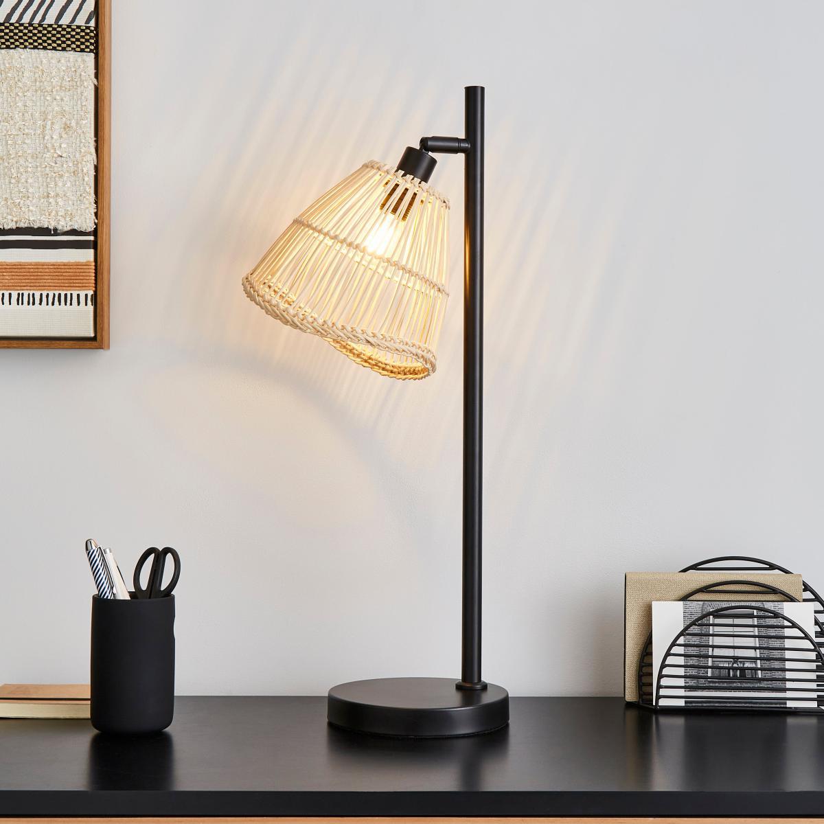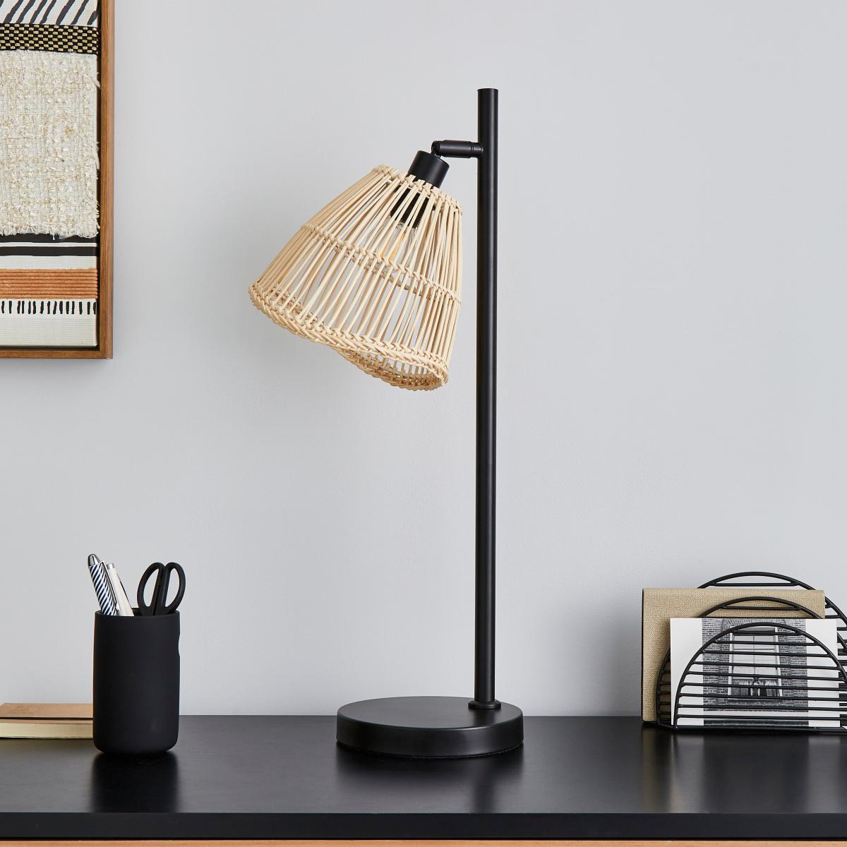 This product is made using sustainable rattan. The plant used for rattan furniture grows naturally without interrupting the present structure and balance of the rainforest. In addition, rattan cleans the air by converting CO2 into clean air. Rattan is an exceptionally sustainable wood, being the quickest developing tropical wood that renews in only 5 - 7 years. Part of the Elements trend, this stylish Jaula Rattan desk lamp has a contemporary design that will complement an array of home decors. Featuring a black base and straight stem with an adjustable natural rattan shade, perfect for adding a modern contemporary touch to any room. This piece is dimmable compatible and matching family items are available, helping to coordinate your home to create the dream look.