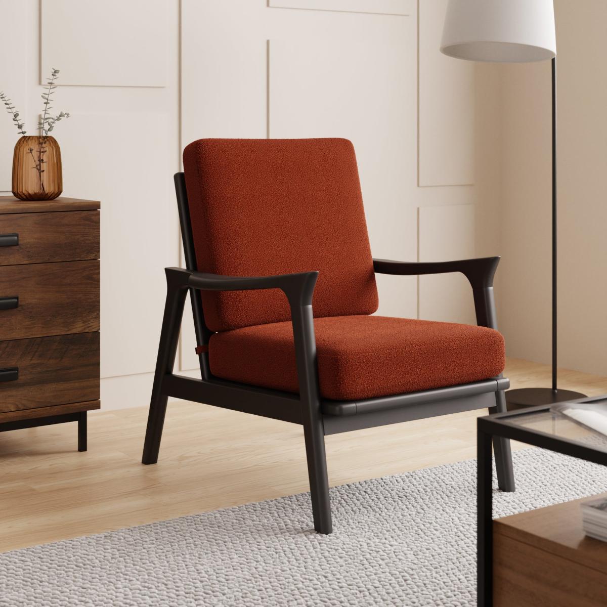 I love this Armchair for its versatile style and cosy appeal. The rich rust tone makes it a warm, inviting focal point that works well in both traditional and contemporary interiors. Its boucle fabric adds texture without overwhelming, making it ideal for lounge areas or as an accent in bedrooms. To style it effectively, try pairing it with neutral-toned cushions or a patterned throw to add visual interest. It also works well next to a statement side table or layered with a soft rug to create a welcoming corner. Overall, this piece is a practical yet stylish choice for adding colour and comfort to any living space.