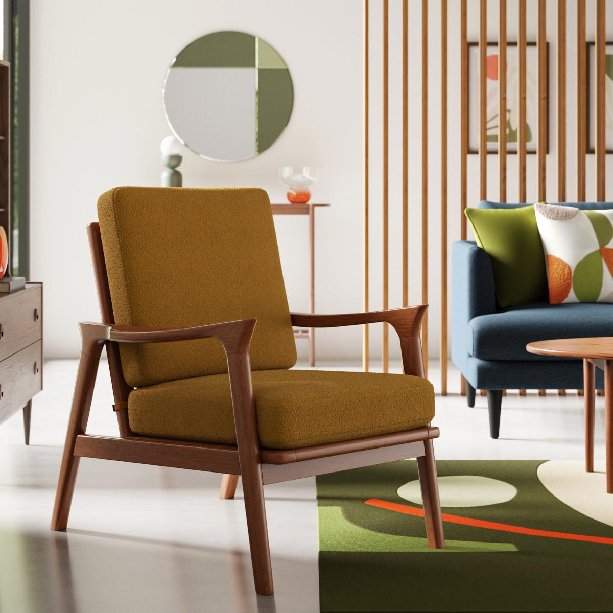The Maddox Boucle is a great pick for adding texture and a touch of vintage charm to both contemporary and eclectic interiors. I love its warm old gold tone, which can act as a statement piece or blend seamlessly into warm neutral palettes. It works particularly well in lounge areas, bedrooms, or reading nooks where comfort is key but style remains a priority. For practical styling, consider pairing it with mid-century modern or minimalist pieces, and don’t shy away from layering it with textured cushions or throws to enhance its inviting appeal. Its self-assembly design makes it versatile for different spaces while maintaining a stylish, contemporary look.