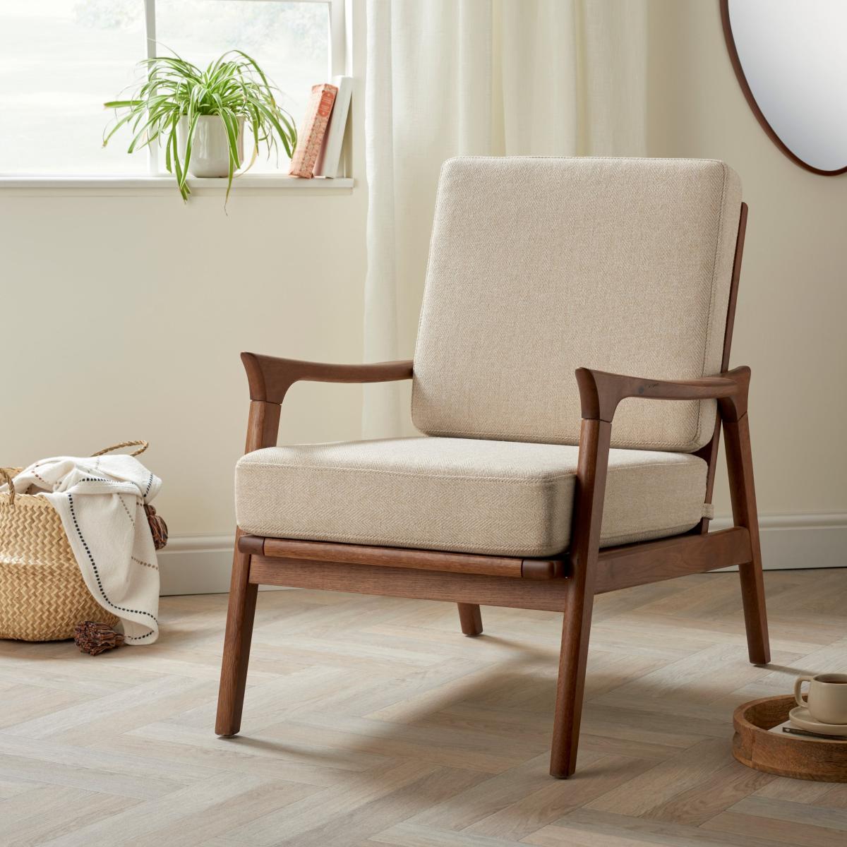 The Maddox accent chair is a versatile piece that works particularly well in both contemporary and mid-century styled interiors. I love its neutral woolly herringbone upholstery, which adds texture and warmth without overwhelming a space. It’s ideal for creating a cosy reading nook or accenting a living room corner. When styling, consider pairing it with soft throws or cushions in complementary tones to enhance its inviting feel. Its clean lines and natural wood frame also make it easy to integrate into Scandinavian-inspired schemes or paired with minimalist furniture for a timeless look. Practical tip: place it near a good reading lamp or beside a small side table to maximise its function as a comfortable, stylish spot for relaxation.