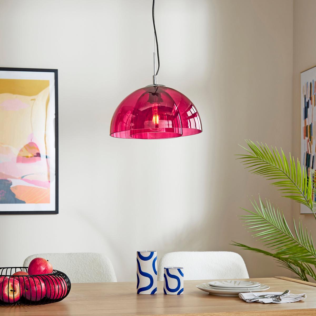 I love the pop of colour that this ceiling light brings to a space. The pink hue makes it a playful yet sophisticated choice, perfect for adding character to a variety of interiors. It works well in modern, contemporary settings, especially in spaces where you want a focal point, like a dining area or a stylish bedroom corner. For styling tips, try pairing it with minimal decor and neutral walls to let the light fixture stand out, or incorporate complementary pink accents for a cohesive look. Due to its bold colour, it’s best suited in spaces with natural light or underdimmed lighting to prevent it feeling overwhelming. Overall, it’s a versatile statement piece for anyone looking to add a touch of vibrancy to their ceiling.
