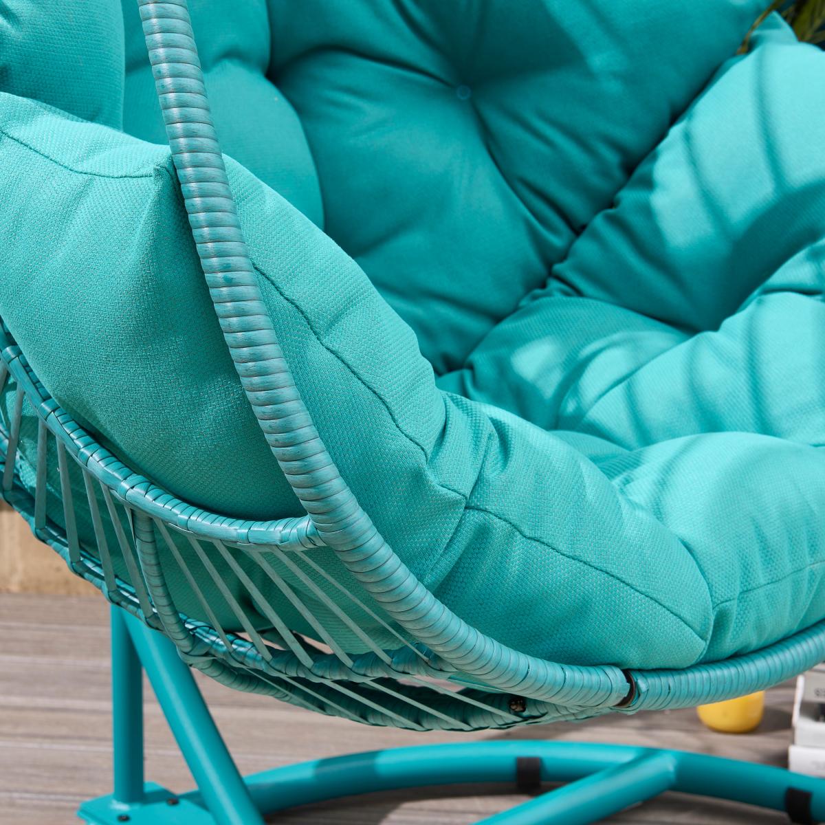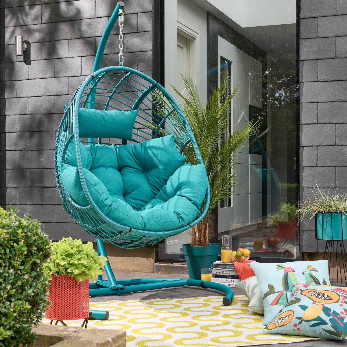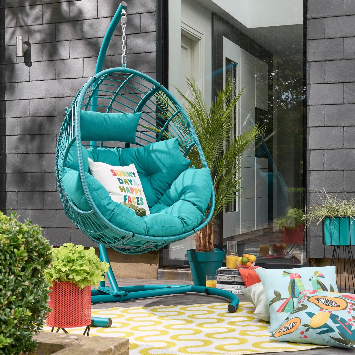 Relax in style with our Elements Peacock Hanging Egg Chair, beautifully designed with a strong metal structure and a modern rattan hanging chair. The chair is weather resistant with a powder coated steel frame, making it suitable for use all year round and is sure to last you for years to come!.