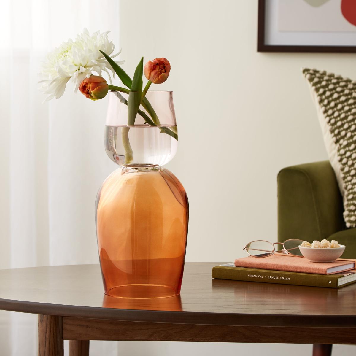I love this vase for its vibrant two-tone orange glass, which adds warmth and colour without overwhelming a space. It works particularly well in contemporary or minimalist interiors, where a pop of colour can really make a statement. For styling, try pairing it with simple white or neutral flowers, like tulips or roses, to let the colour of the vase really shine. It’s also a versatile piece that can work on a side table, bookshelf, or dining table, especially when grouped with other textured or glassware items. To keep the look clean and modern, avoid overcrowding and let the vase be the star of your arrangement.
