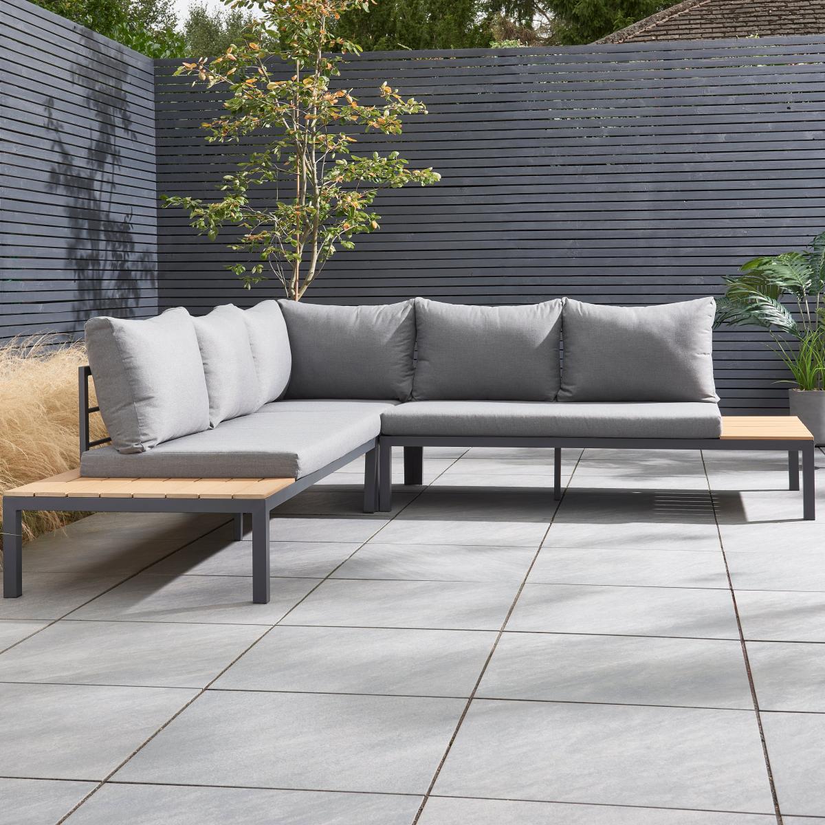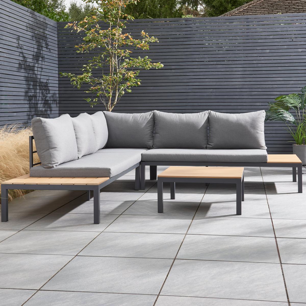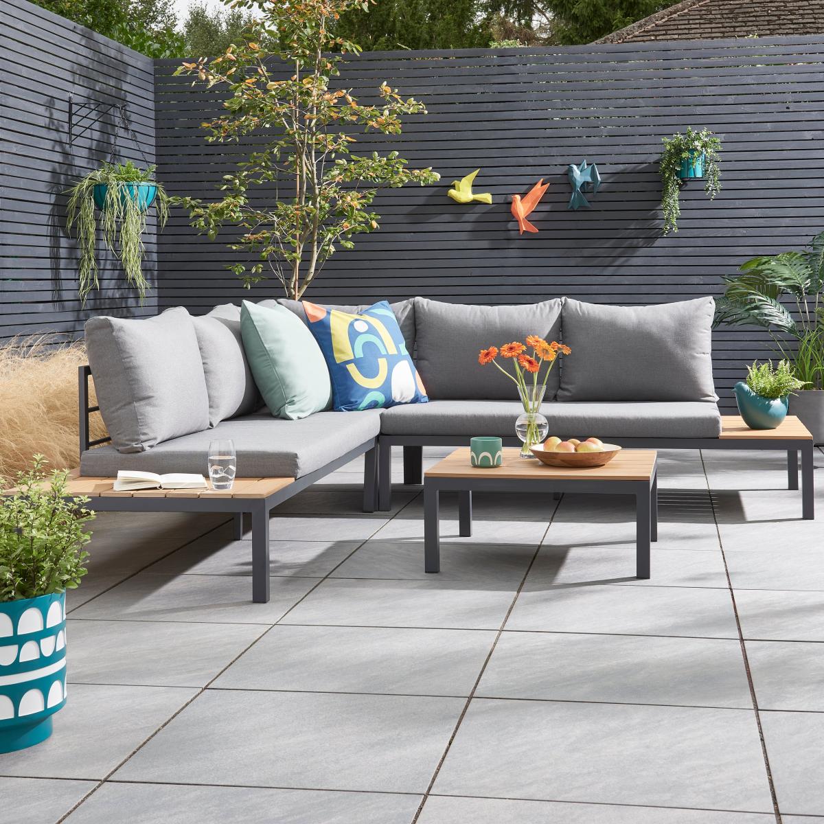 I love the Elements slatted wood corner sofa set for its sleek, contemporary look that works equally well in modern or minimalist garden spaces. Its grey tone is versatile, easily complementing a variety of colour schemes and outdoor styles. For styling tips, consider adding cushions and throws in vibrant or seasonal colours to create a cosy, inviting vibe. Incorporating some potted plants or garden accessories around the seating can soften the look and bring a touch of nature closer. Practical for both relaxed afternoons and outdoor dining, this set pairs effortlessly with different table sizes and live-edge wood accents or metal finishes for a personalised, functional outdoor lounge.