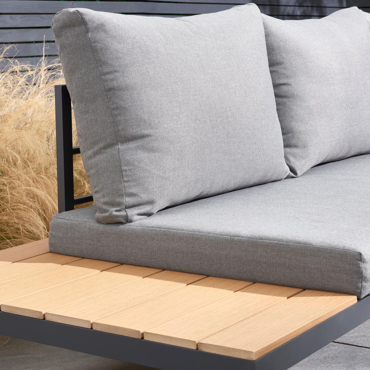 Featuring the Elements Slatted Wood Corner Sofa Set, with two 2-seater sofas, 1 corner sofa and 1 table. This corner sofa set would make a striking addition in any garden and is perfect for relaxing in summer. Crafted from polywood for lower maintenance, the table and chairs are made from light weight and durable aluminium. This stylish set comes complete with generously filled seat cushions for ultimate comfort and back support.