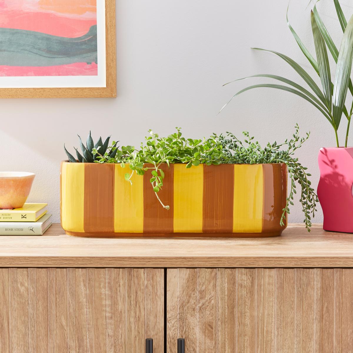 I love this striped ceramic window sill pot for its bold yet simple design, which adds a splash of colour and pattern without overwhelming a space. It works particularly well in contemporary or boho interiors, where playful touches and vibrant accents are appreciated. For styling, consider pairing it with trailing plants like ivy or pothos that cascade over the edge, creating a relaxed, lived-in feel. It’s also versatile enough to sit alongside neutral tones or other colourful accessories, making it a great focal piece on a sunny windowsill or shelf. To keep it looking its best, ensure the plants are suited to its size and always use a saucer to protect surfaces from excess water.
