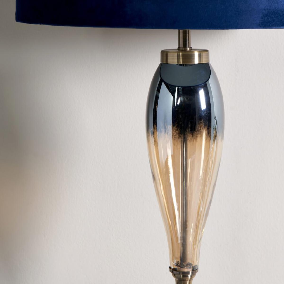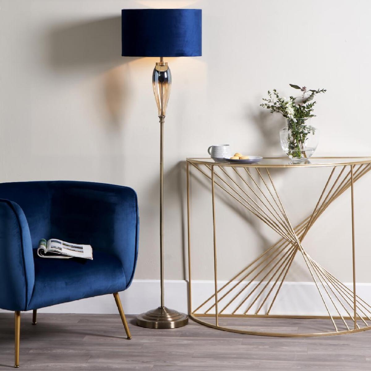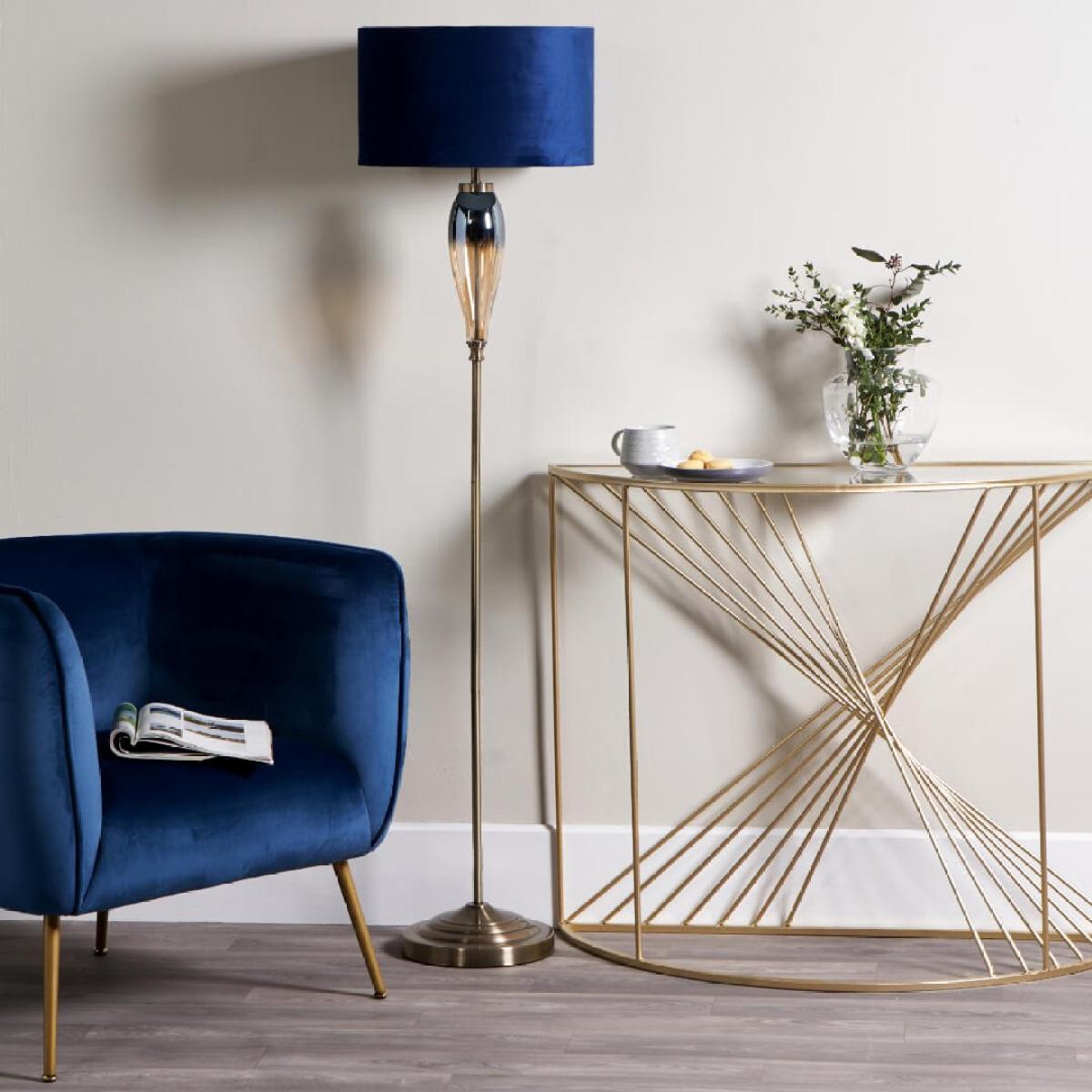 The Elena blue floor lamp is an elegant shaded brass floor lamp with a glass deatiling in the base. Finished in a rich ombré royal blue with brass detailing. The tall elegant shape and wide drum-shaped shadelamp make it so easy to place in a bedroom, or living room. Also, available in a matching table lamp.. - Requires 1x ES27 GLS bulb (Max 9 watts). - Shade Dimensions: H23xD41xL4. 1 cm.. - Base Dimensions: H141xD26xL2. 6 cm.