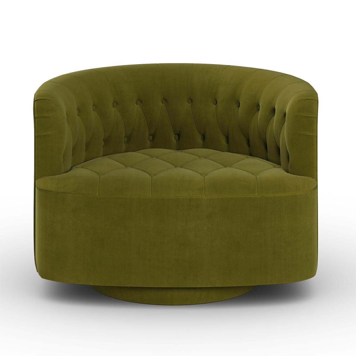 * Rubberwood Legs* Foam and Fibre filled seat* Swivel Mechanism Upholstered in luxurious fabric and adorned with elegant button tufting, this chair exudes timeless charm and style. Its swivel feature allows you to effortlessly turn and glide, offering convenience and flexibility in any space. Sink into its plush seat and let the stresses of the day melt away as you indulge in a moment of relaxation.