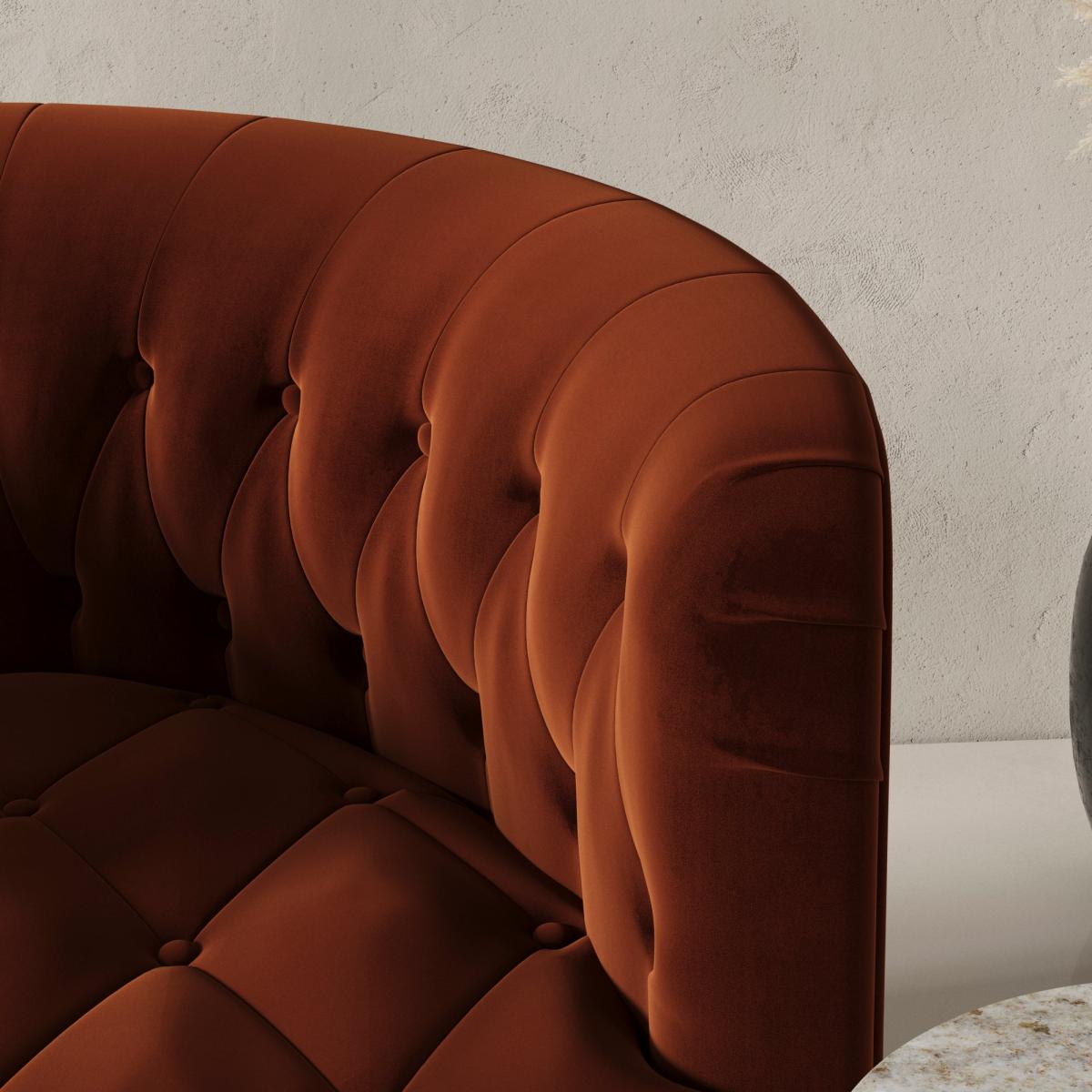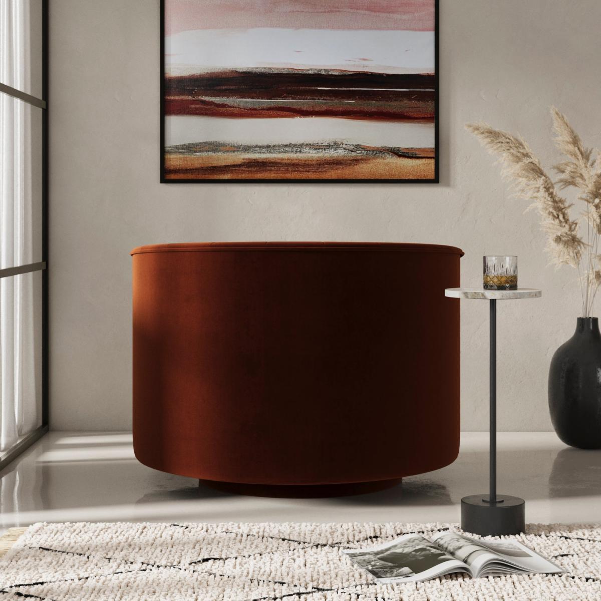 I’m a fan of the Elena swivel chair in that rich umber velvet for its compact, curving silhouette and deep button-tufting - it brings both comfort and a sculptural note without overwhelming a room. The swivel base adds practical flexibility, making it ideal for a snug reading corner or as an accent piece in an open-plan living area. This armchair suits schemes from mid-century modern to contemporary boho. Pair it with a neutral jute rug and a slim metal side table in black or antique brass to let the warm hue pop. Add a tweed or boucle cushion in cream or soft grey for texture, and balance the look with a statement floor lamp or a grouping of dried grasses in a dark ceramic vase.