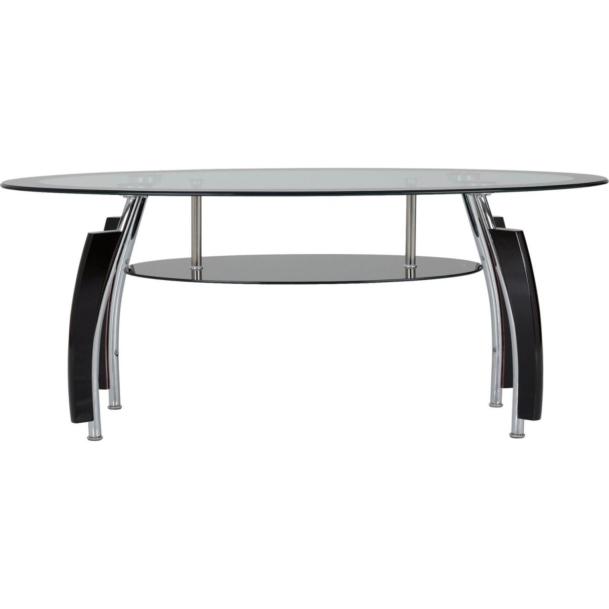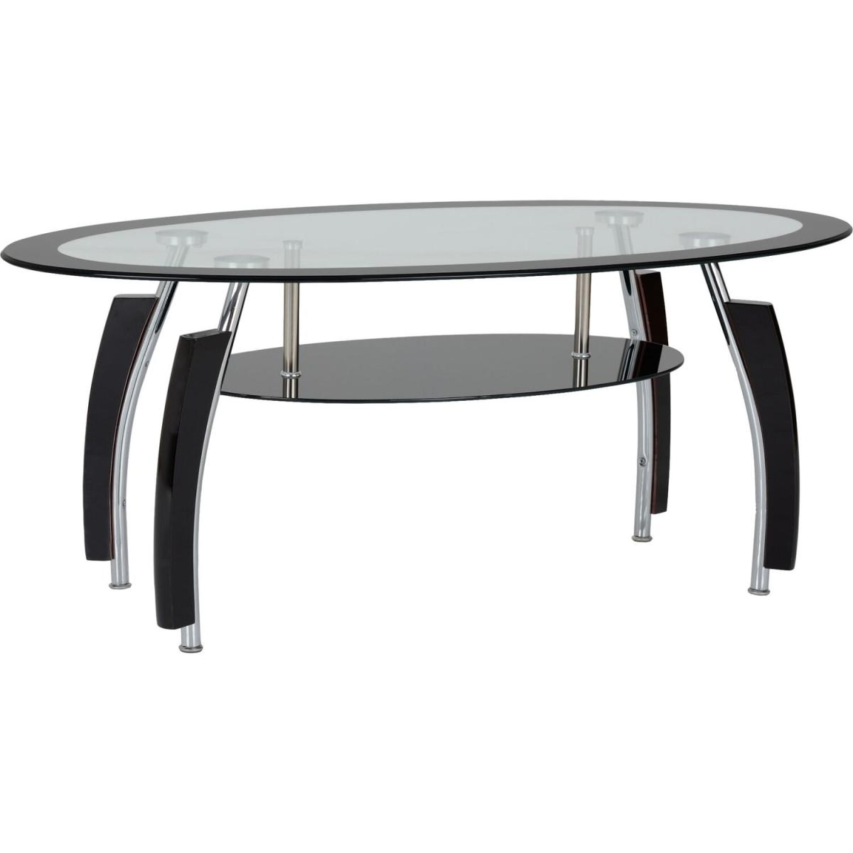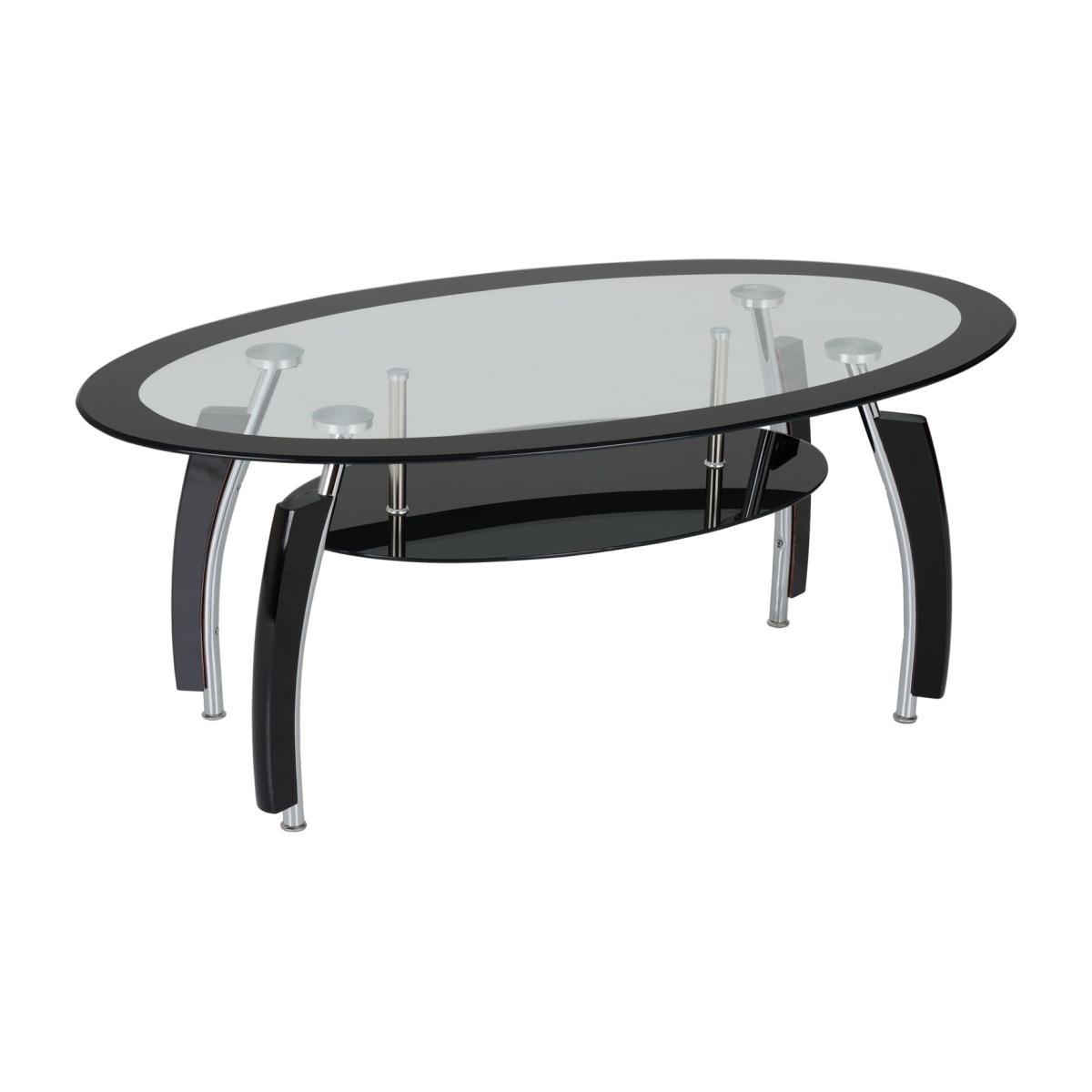 The sleek oval shape of the elena coffee table in glass, is combined with the arched black legs, that gives your home that comfortable but modern look!With ample space the top shelf is perfect for ornaments and vases to give the piece a more modern look, and just to further complement the piece there is a bottom shelf perfect to store tv remotes and magazines for easy access and no more searching