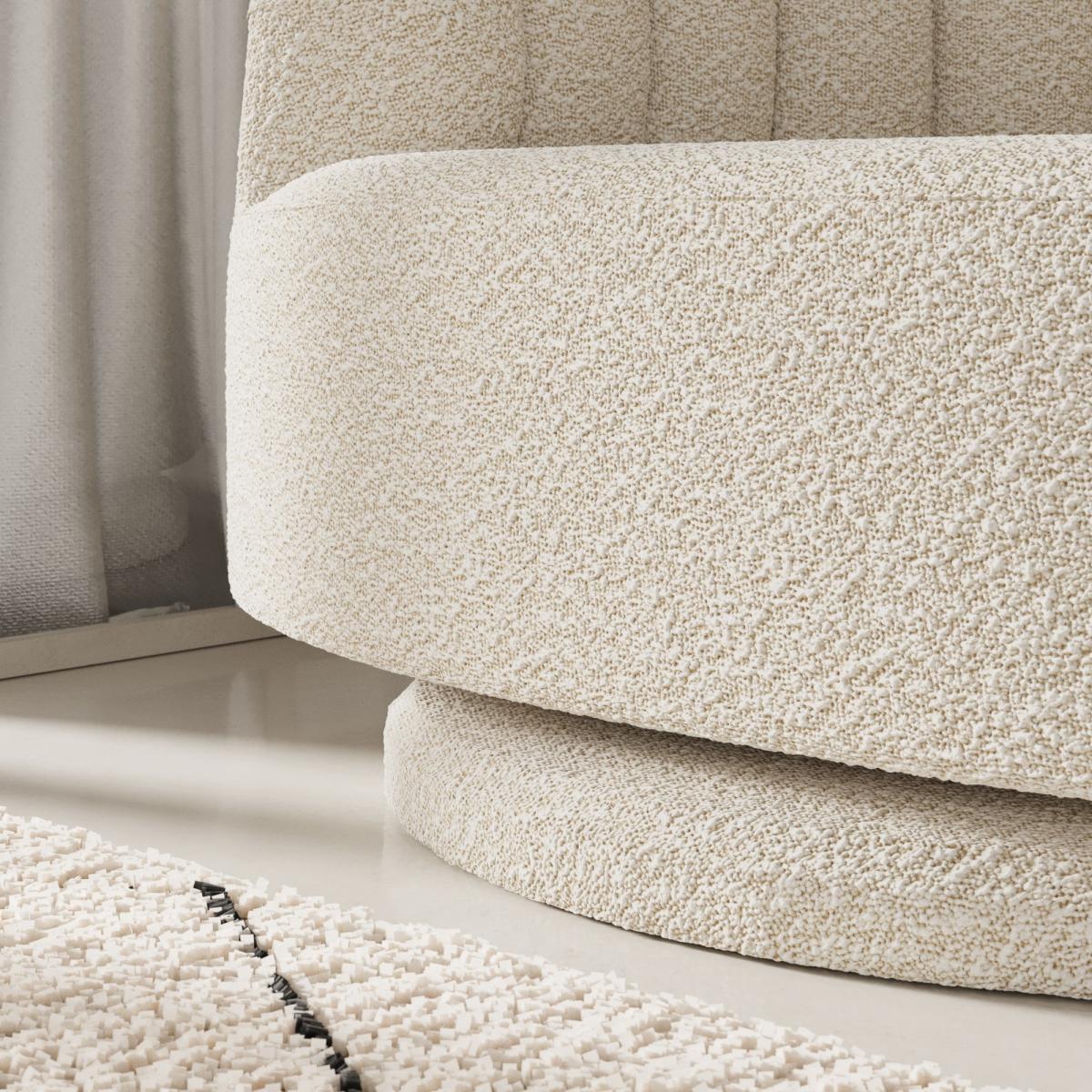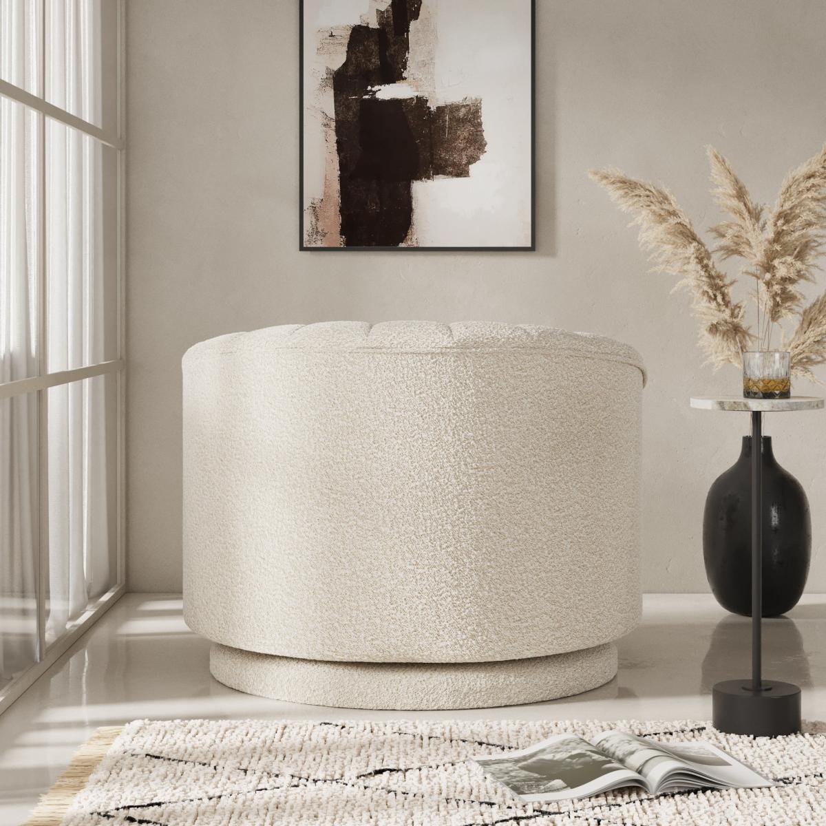 I’m a fan of the scalloped swivel chair because its curved lines and boucle texture introduce both comfort and visual interest without overwhelming a room. It suits Scandi-inspired schemes, minimalist lounges or contemporary reading corners, and the gentle ivory tone plays nicely against darker woods or muted pastels. For styling, position it on a low-pile jute or wool rug and add a contrasting cushion in slate grey or forest green to break up the light upholstery. A slim floor lamp or narrow side table beside it keeps sightlines clear, and the 360° swivel makes it perfect for open-plan living - turn it towards your sofa for conversation or your window for a relaxed spot to unwind.