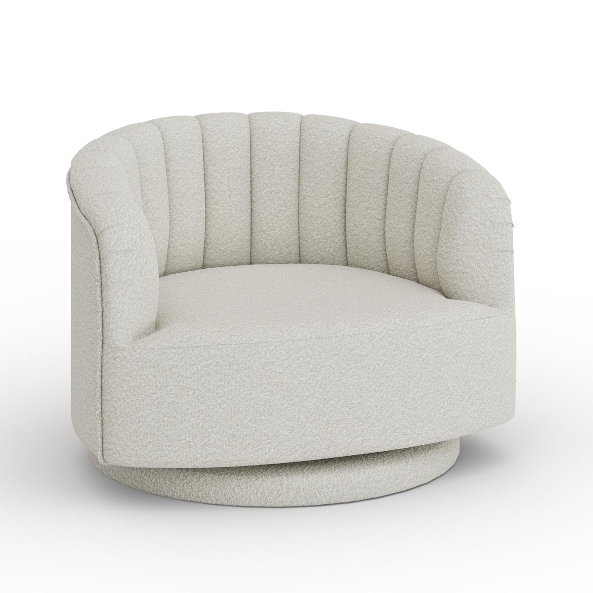 * Ivory boucle fabric* Foam and Fibre filled seat* Swivel Mechanism Upholstered in premium fabric and featuring a charming scalloped design, this chair brings a touch of sophistication to any space. Its swivel base offers effortless mobility, allowing you to turn and glide with ease. Sink into its plush seat and experience unparalleled comfort as you unwind after a long day.