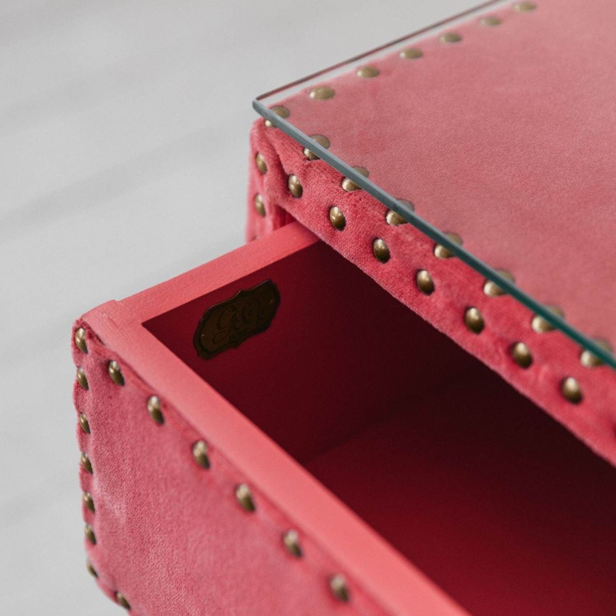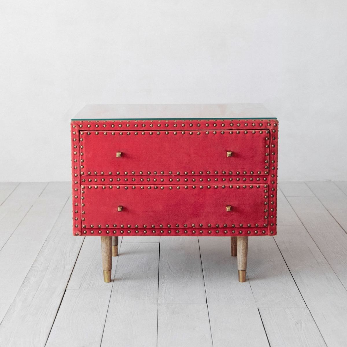 Our Eleonora Bedside table, upholstered in a vibrant coral velvet features brass rivet details. With two drawers, brass tipped tapered wooden legs and a protective glass top, this a practical yet statement piece, perfect for eclectic interiors.