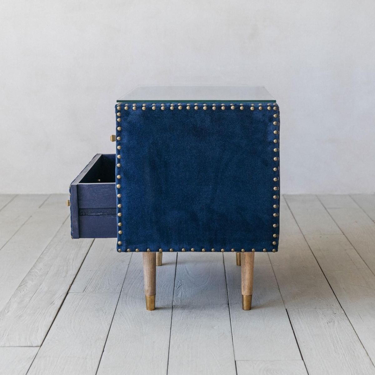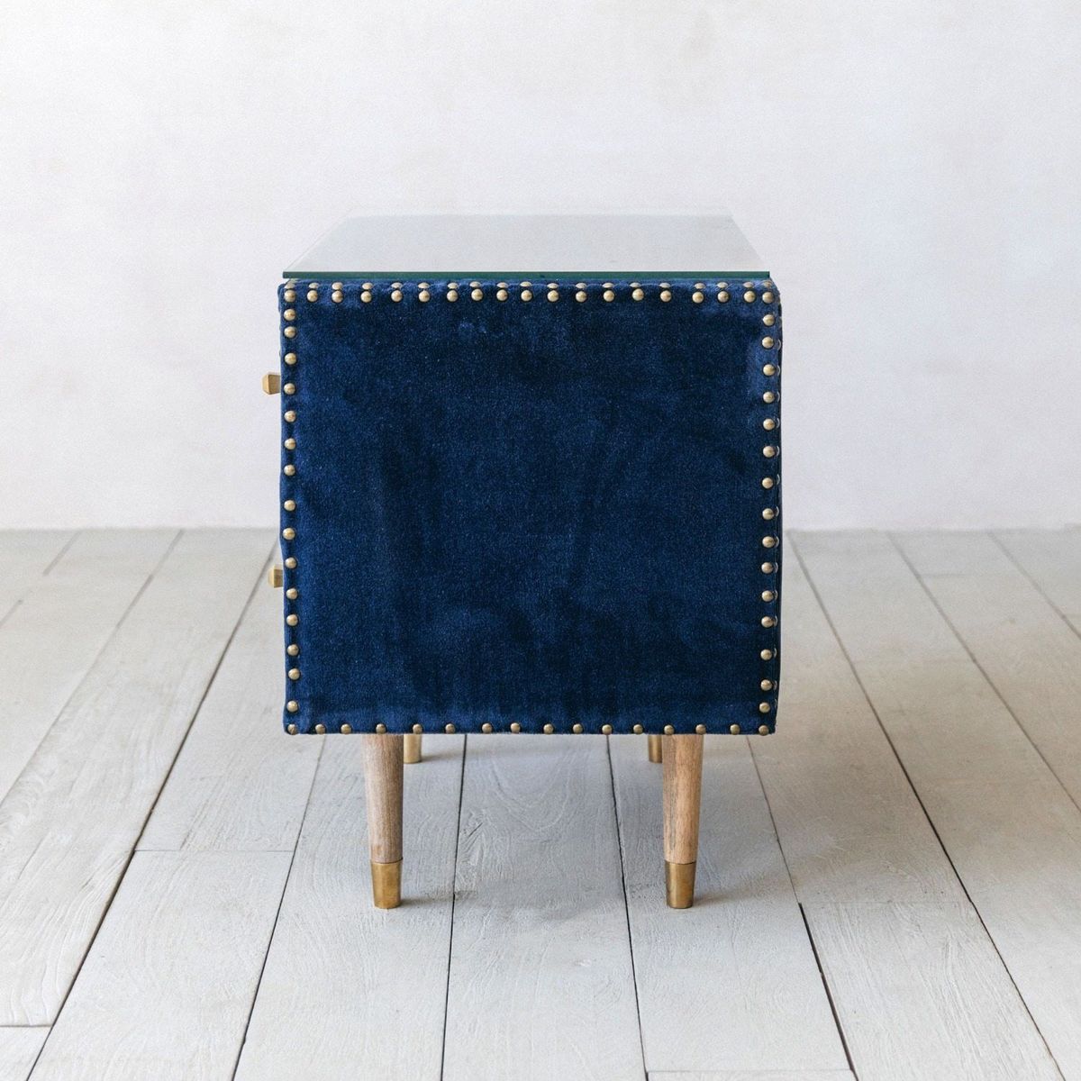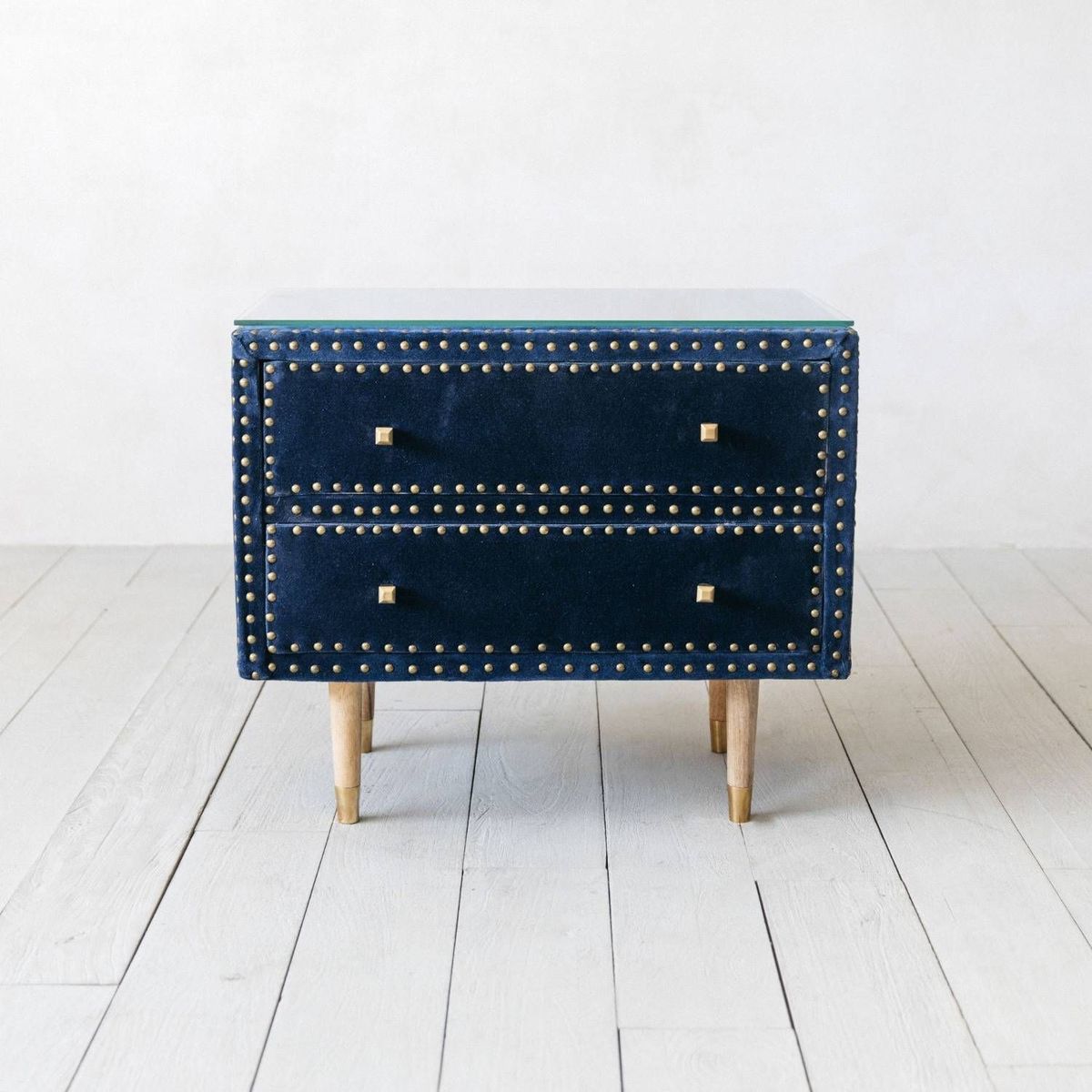 Our Eleonora Bedside table is upholstered in a vibrant sapphire blue velvet and features brass rivet details. With two drawers, brass tipped tapered wooden legs and a protective glass top, this a practical yet statement piece.