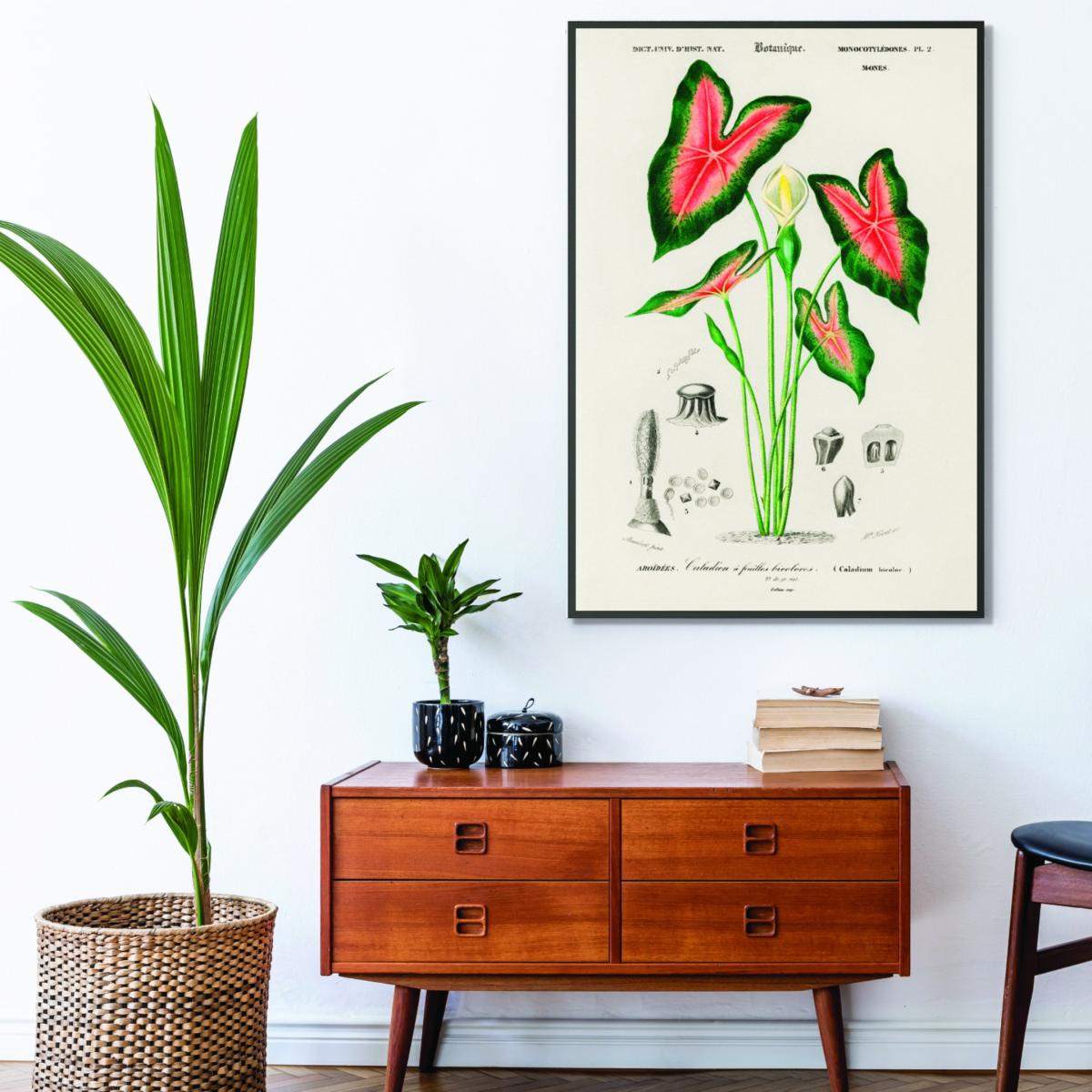 I love this print because it offers a lively pop of colour and a touch of botanical charm, making it an ideal accent piece for both modern and eclectic interiors. The Elephant Ear Print works particularly well in space where you want to introduce a fresh, natural vibe-think kitchens, conservatories or feature walls in living areas. To style it effectively, consider pairing it with neutral or muted backgrounds to let the vibrant colours stand out, or combine it with other botanical prints for a curated, jungle-inspired look. Because it’s small, it’s perfect for shelf arrangements or smaller wall sections, making it versatile without overpowering the space.