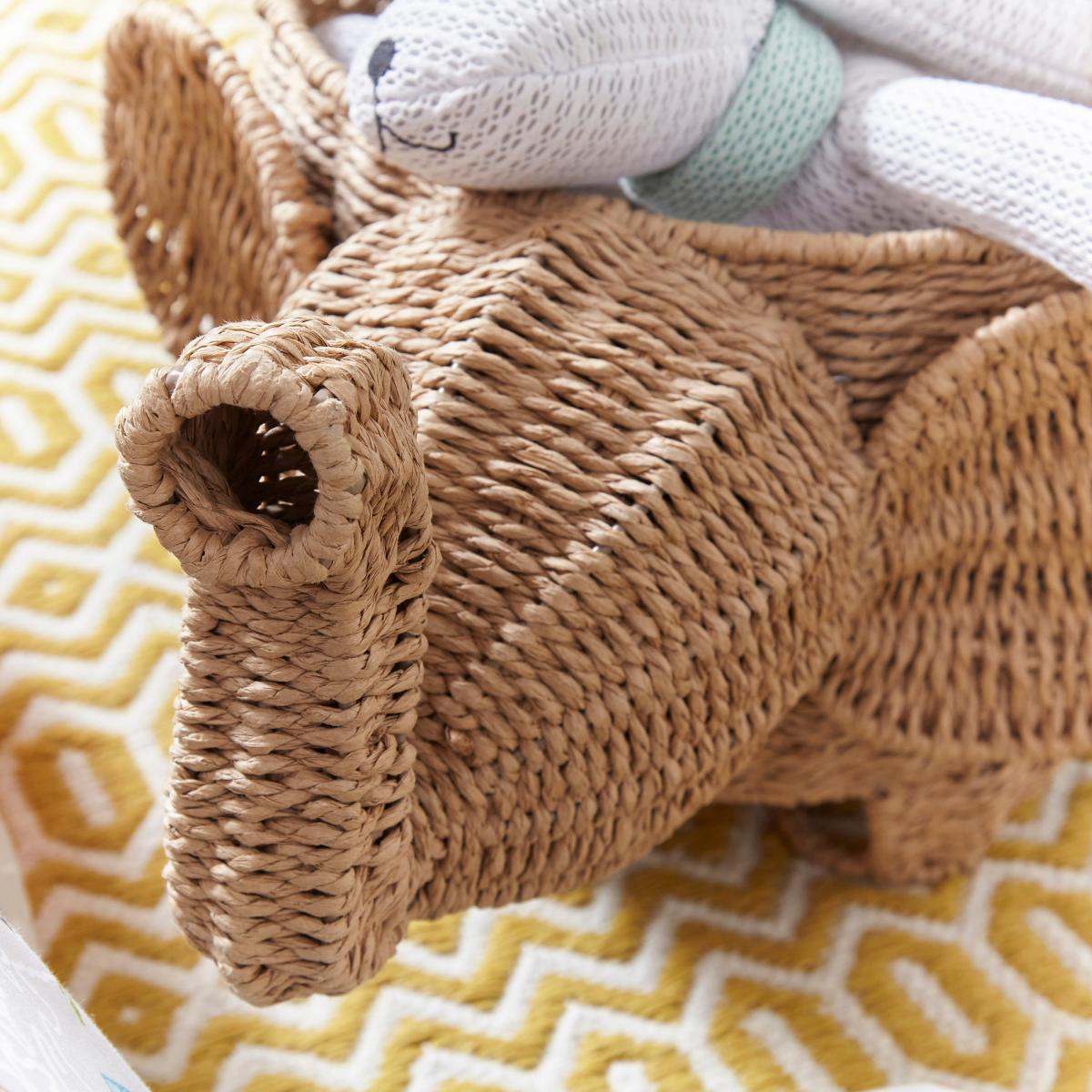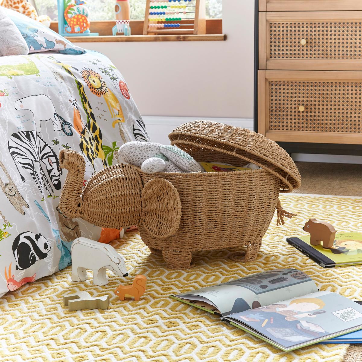 I love the elephant basket’s natural rattan finish-it adds a warm, tactile element that suits a variety of interiors, from Scandi and boho to more eclectic kids’ rooms. Its shape and playful elephant design make it both practical and fun, perfect for storing toys, books, or small accessories without overwhelming the space. For styling, consider pairing it with soft, neutral tones or adding colourful complementary accessories like cushions or rugs to keep the room lively yet cohesive. It works well on open shelving, next to beds, or in corner units, helping to keep clutter tidy while adding a charming touch to the overall nursery or child's bedroom aesthetic.