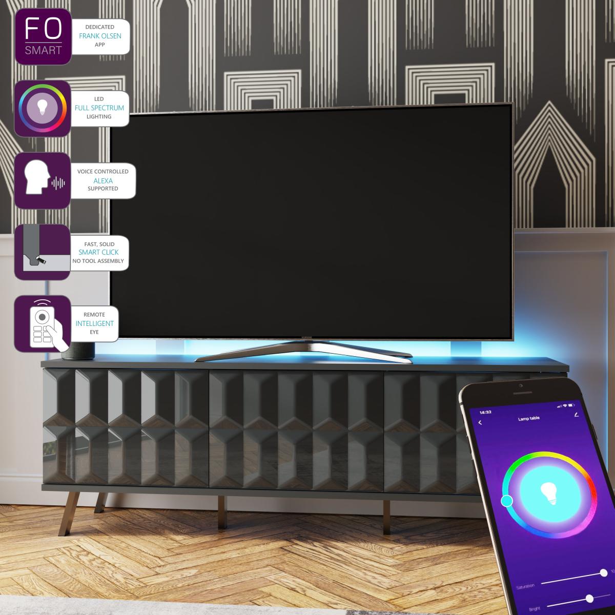 This super sleek Elevate SMART LED TV Cabinet elevates your home to the next level with modern design and smart tech capability. This unit has intelligent eye remote control allowing up to six pieces of AV equipment to be operated with the doors closed. Gone are the days of switches as the full colour spectrum LED mood back lighting can be operated by the free Frank Olsen app or voice control via a smart speaker, so you can really show off to your guests. Featuring push to open doors with internal shelving to store away all your bits and bobs, this deep textured contemporary table has a high-gloss painted finish with unique smoked chrome legs. Please note: deliveries not included are Remote Scotland, Highlands, Ireland, Isle of Man, Channel Islands etc.