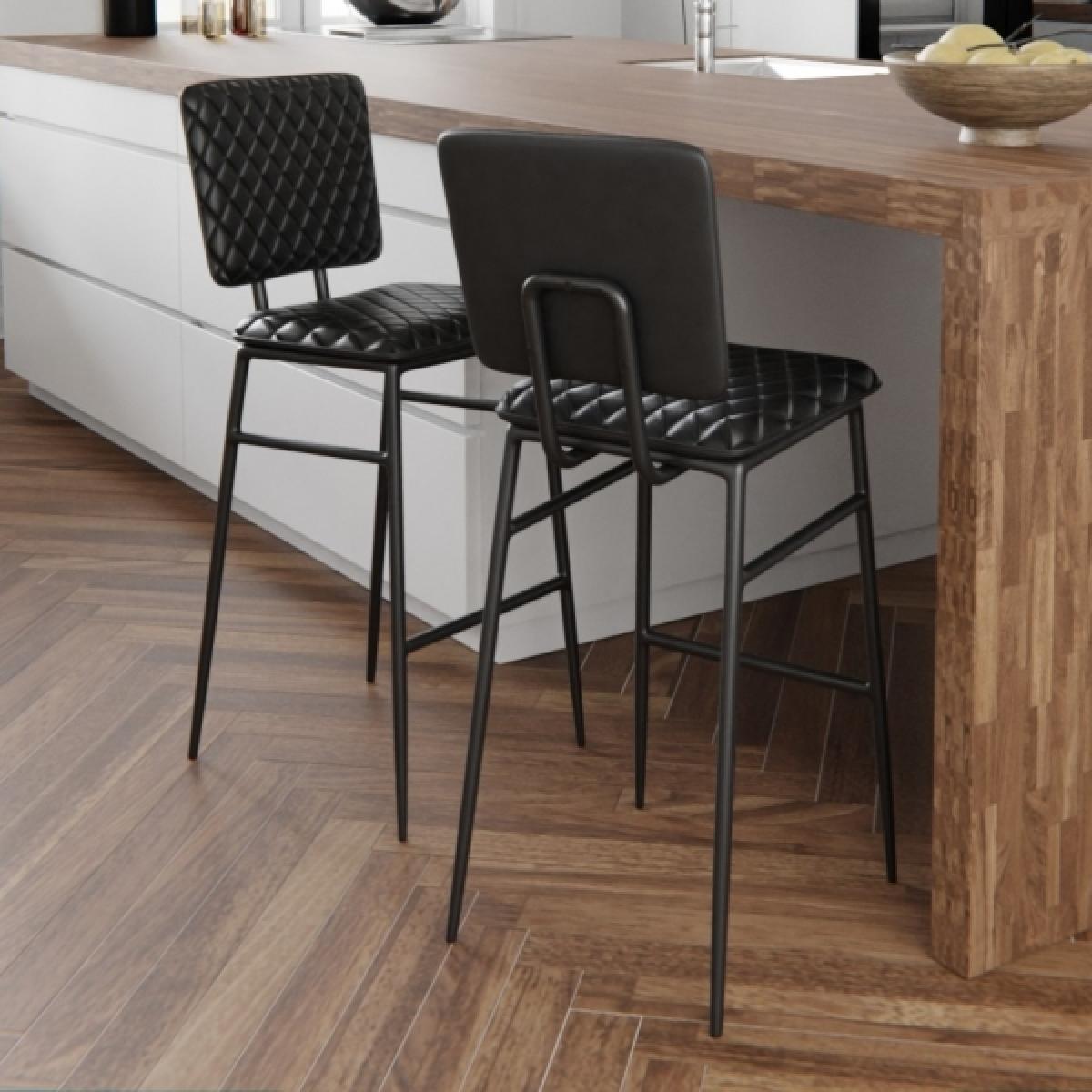 This is the Elgin - a bold, sophisticated metal kitchen stool that will add an industrial charm to your kitchen. Showcasing a quilted black faux leather upholstery and a sleek metal frame that emanates a retro vibe. Complete the look with a reclaimed wood dining table. View The Elgin Range