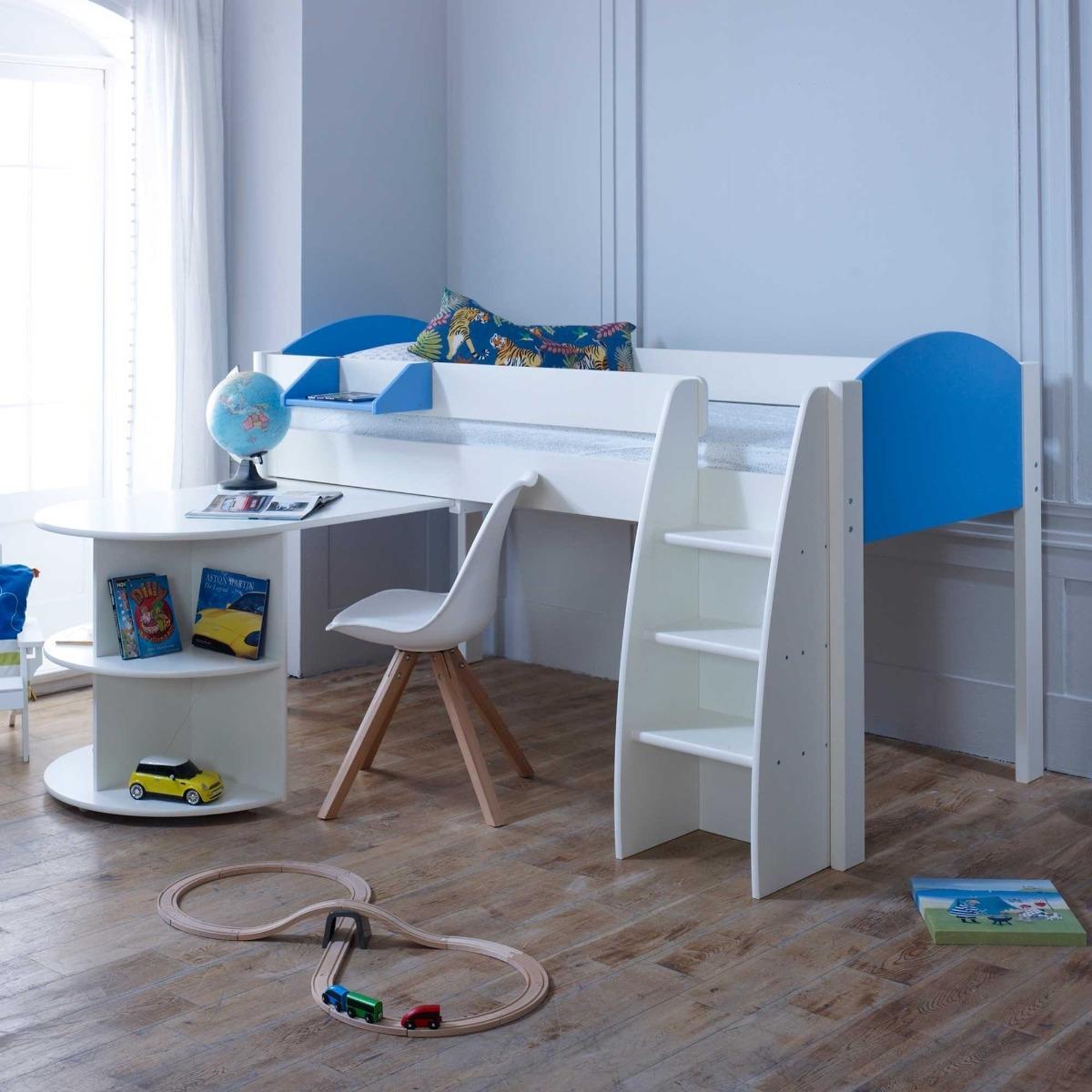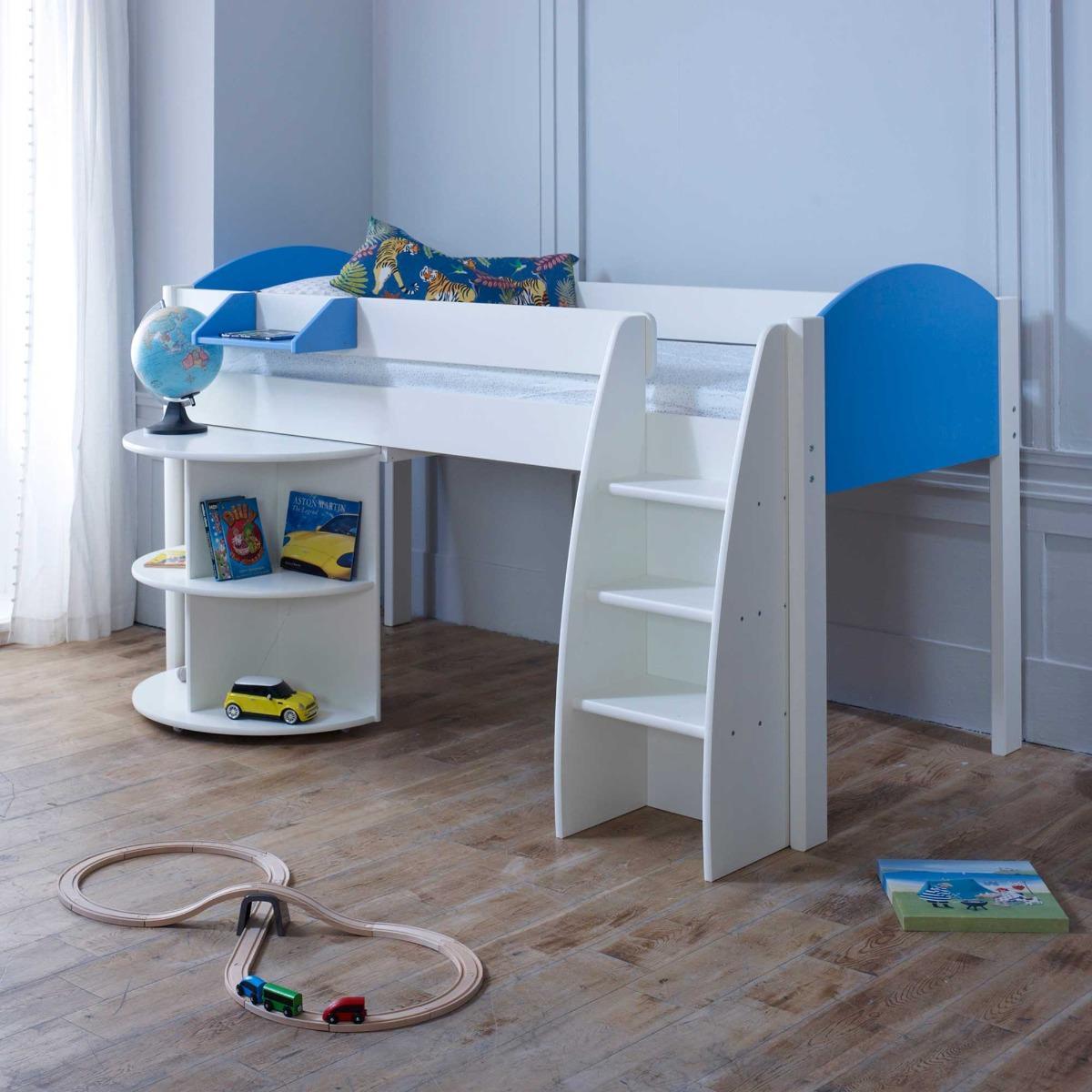 Design. Offering three colour choices to suit every child’s space, the Eli mid sleeper bed with pull out desk is as stylish as it is smart. Raised off the ground to make the most of the space below it, the bed frame features a compact desk that fits snugly underneath and extends out when required. Additional shelves provide all-important storage space, whilst a sturdy and safe step ladder ensures an easy climb up.