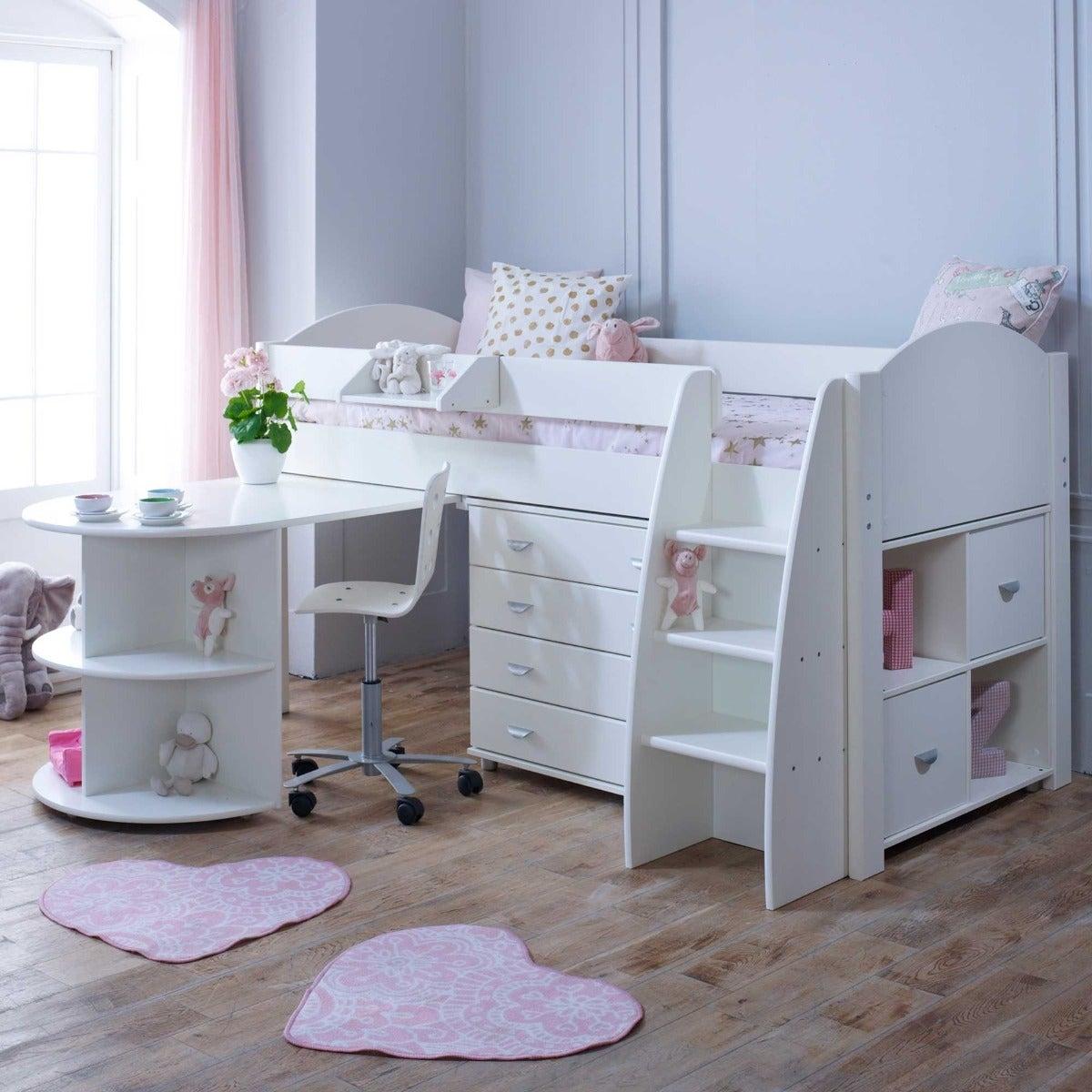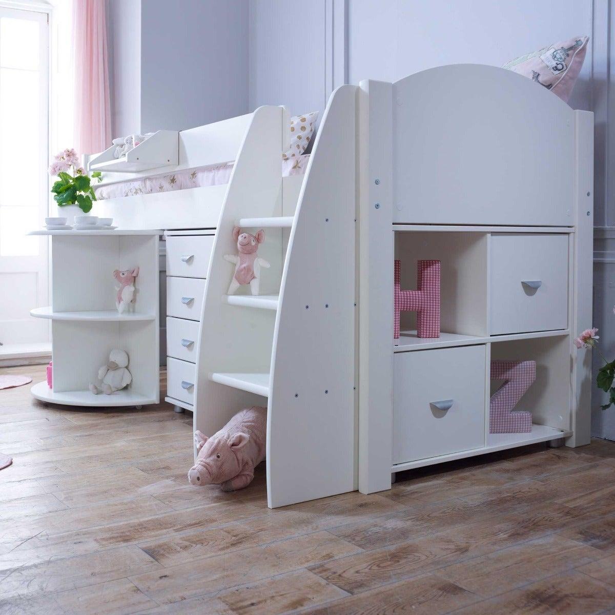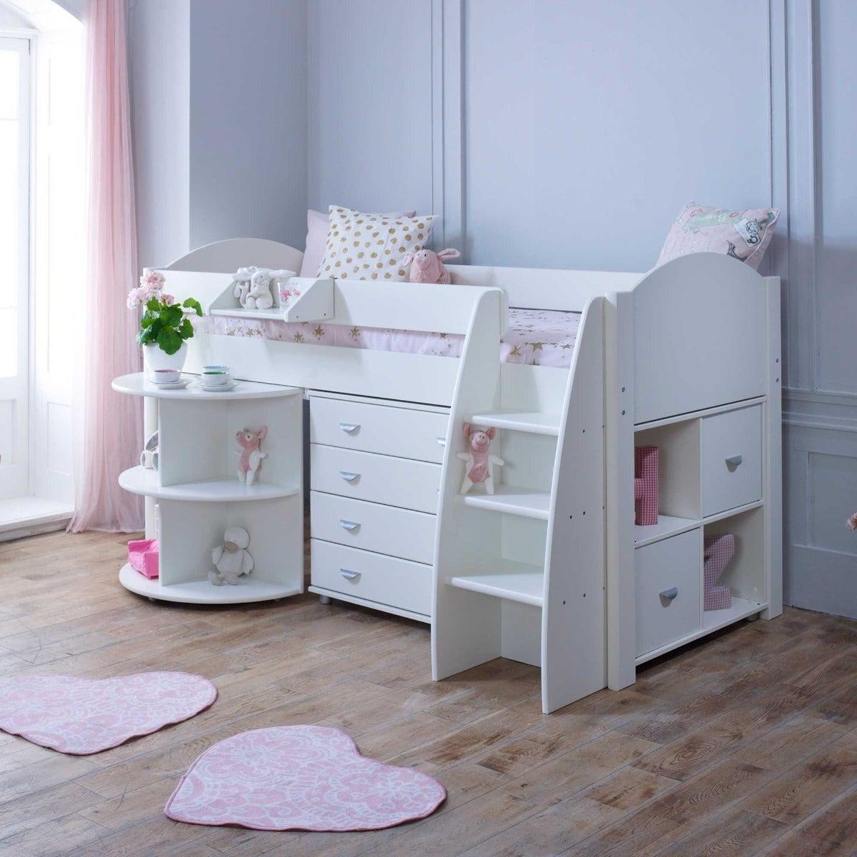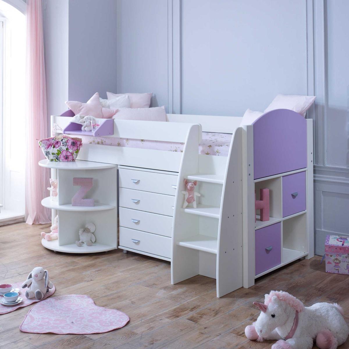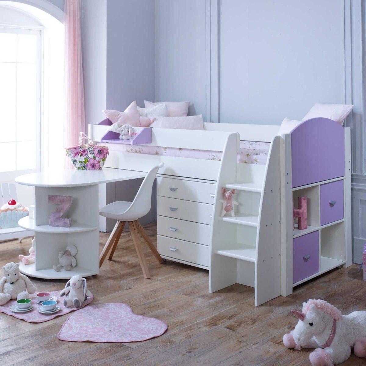Design. With practicality built into every inch, the Eli mid sleeper bed with pull-out desk, storage and chest keeps clutter to a minimum in the cleverest of ways. The bed frame’s raised design allows the space beneath it to be utilised to the full – with shelves, drawers and an extending desk on castors sitting snugly inside it. Finished in a fresh white hue, it offers lilac or blue accents to suit your child’s taste, whilst a wide step ladder and safety rail keep them snug and secure on their way to sleep.
