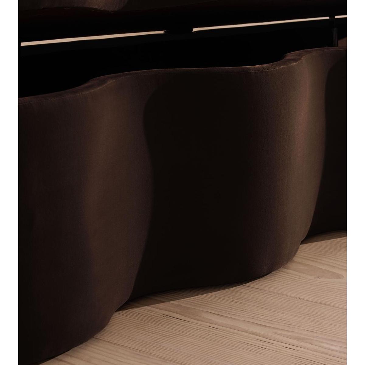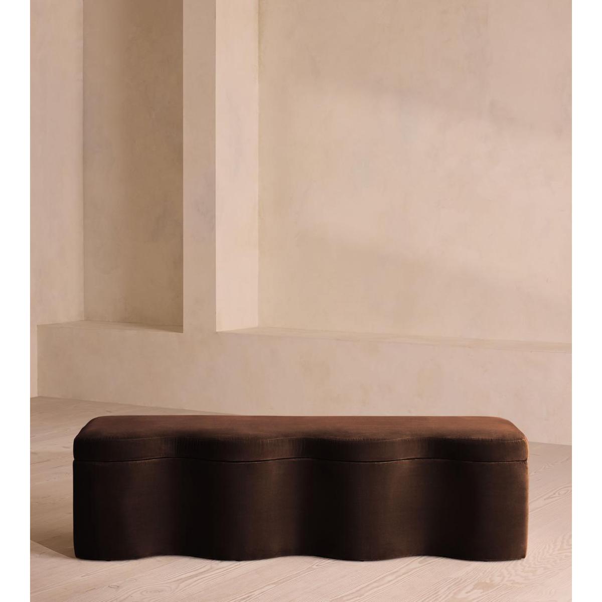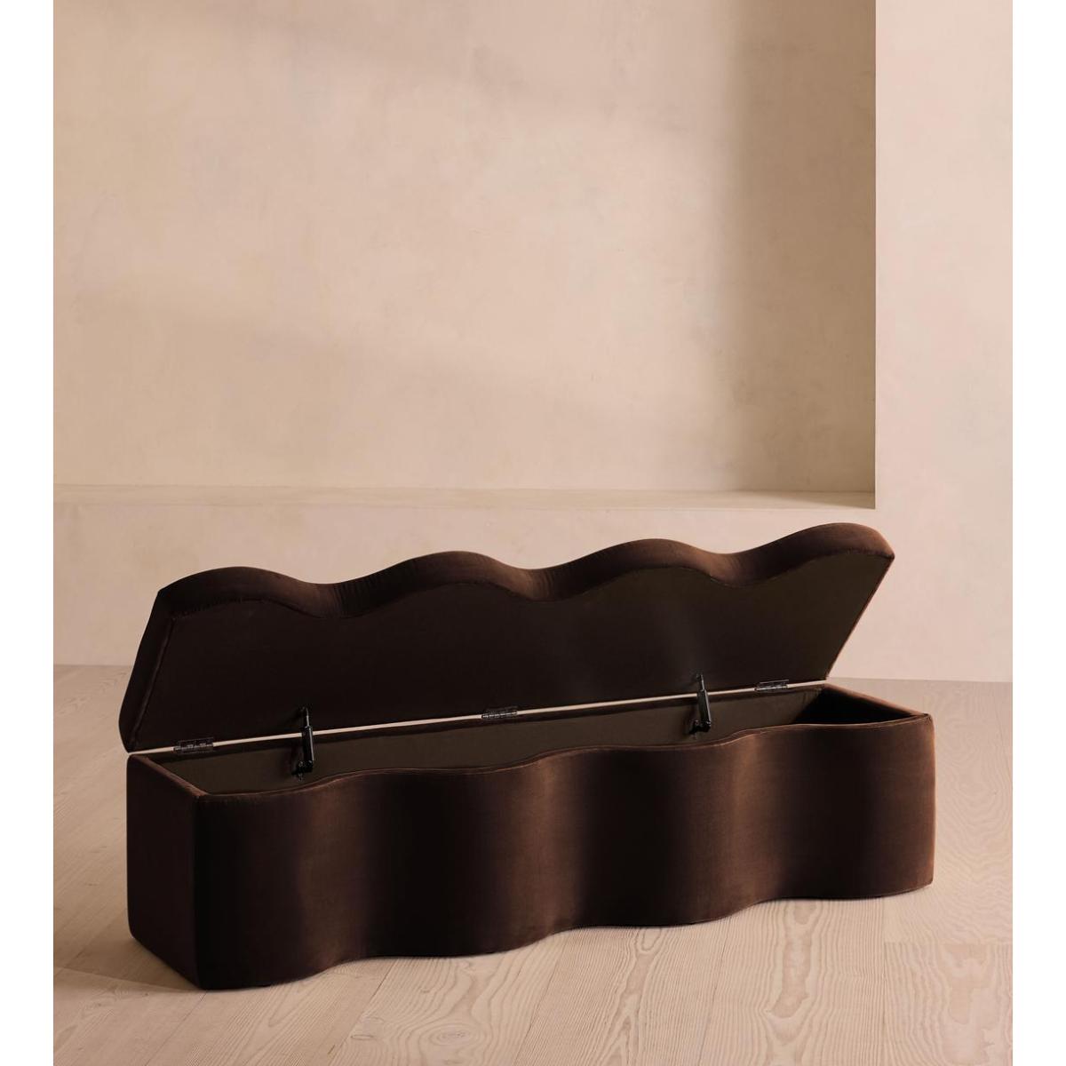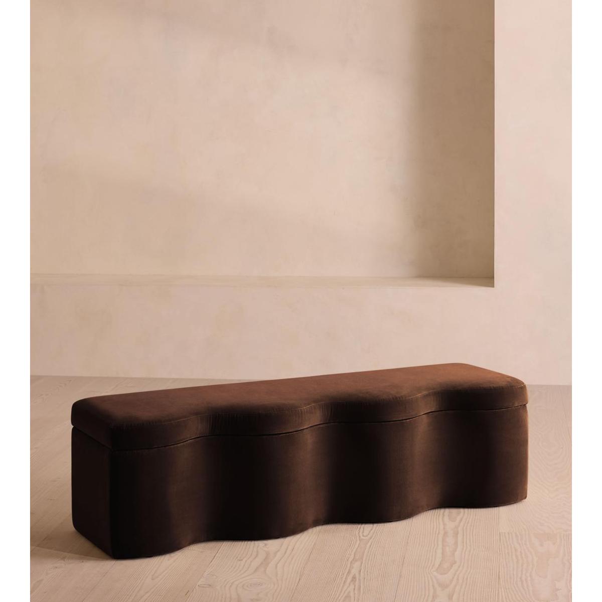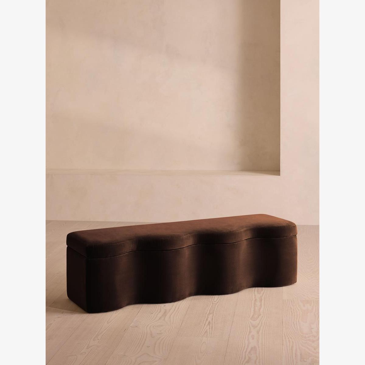 A hardwood frame creates a waved silhouette fitted with a hinged lid that doubles up as seating, thanks to the soft top. Designed to be placed at the foot of your bed, our Eli ottoman has a unique, wave-shaped silhouette crafted from wood and fully upholstered in velvet. Its hinged lid reveals internal storage space for blankets, shoes or clothing, while its bespoke palette is designed to match across our bedroom collection.