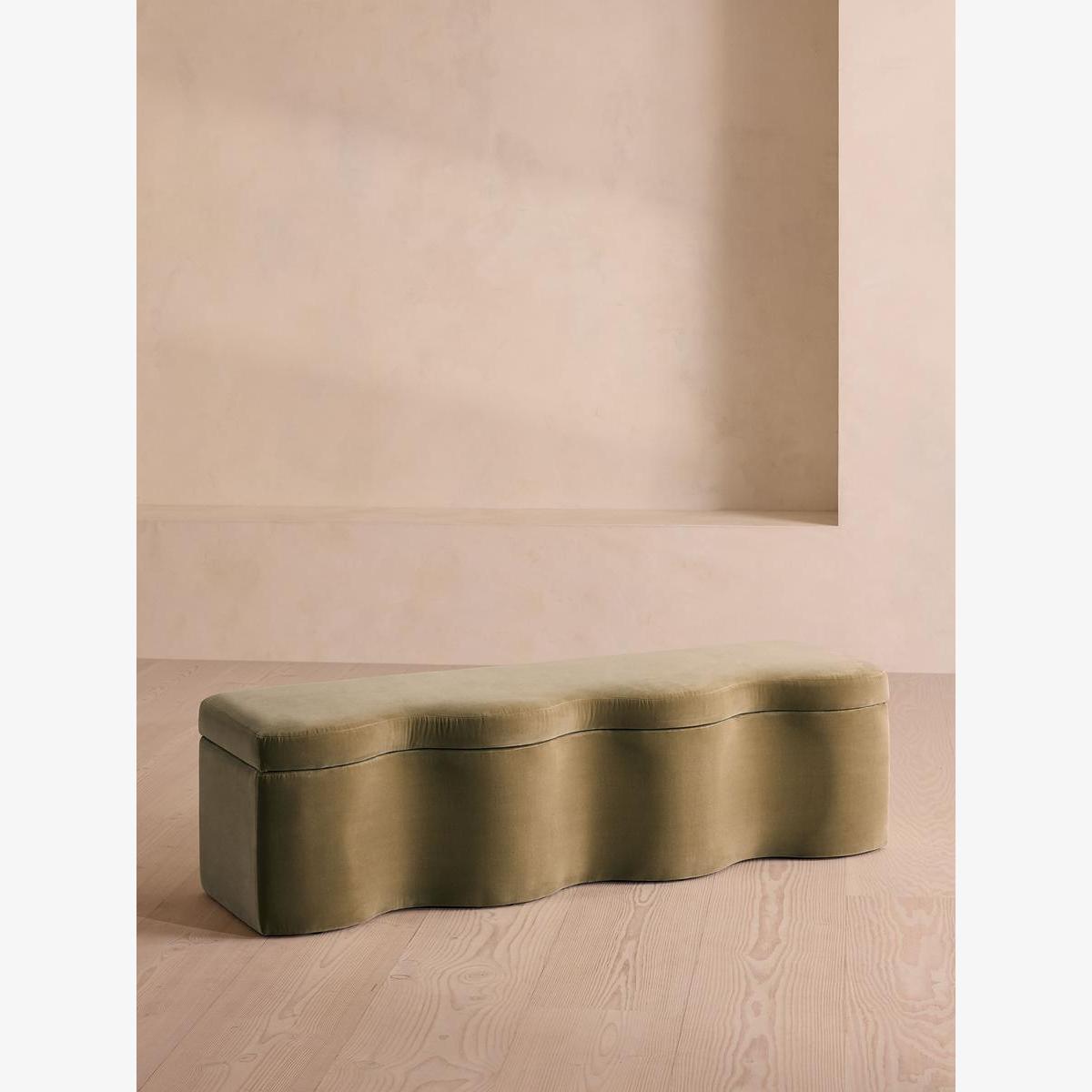 A hardwood frame creates a waved silhouette fitted with a hinged lid that doubles up as seating, thanks to the soft top. Designed to be placed at the foot of your bed, our Eli ottoman has a unique, wave-shaped silhouette crafted from wood and fully upholstered in velvet. Its hinged lid reveals internal storage space for blankets, shoes or clothing, while its bespoke palette is designed to match across our bedroom collection.