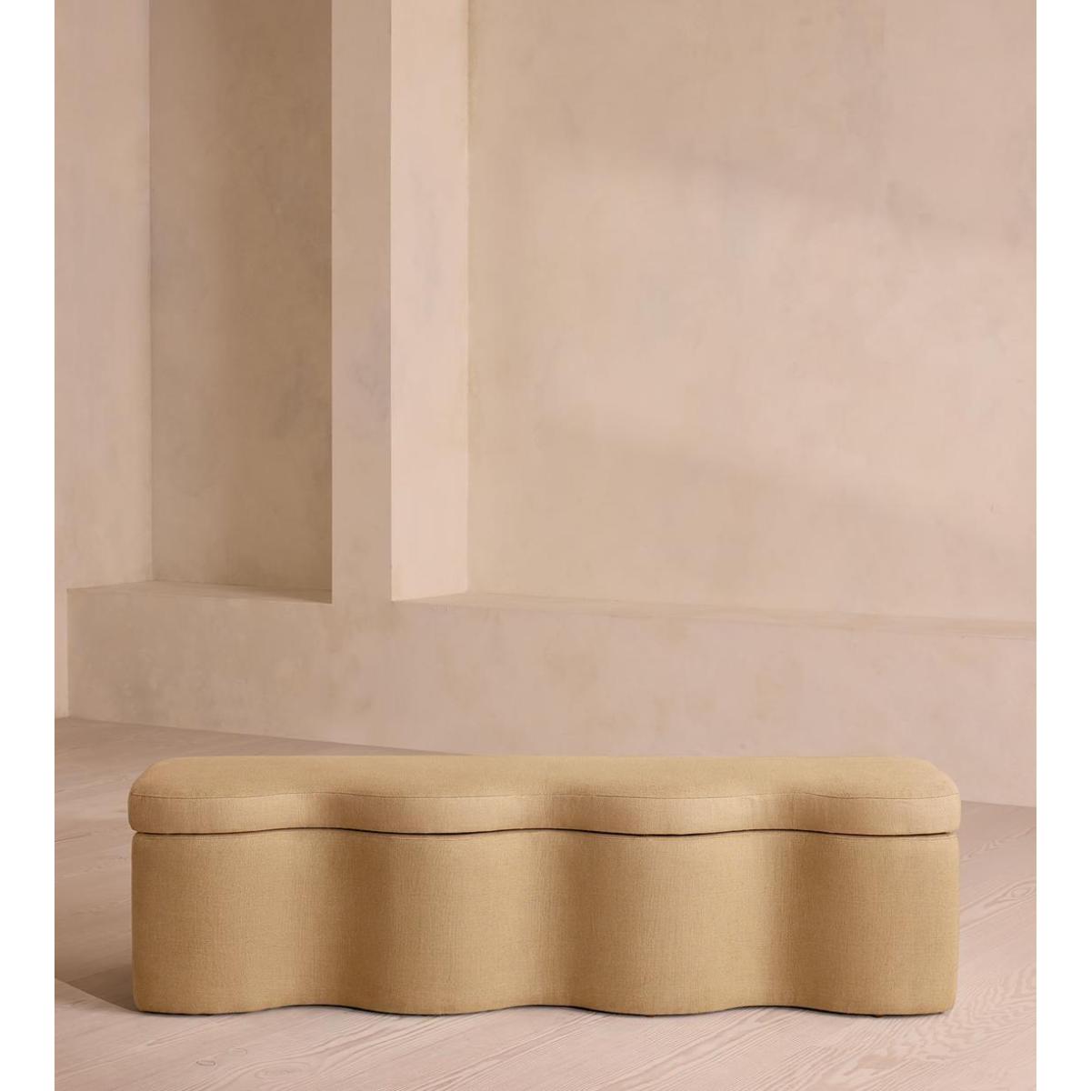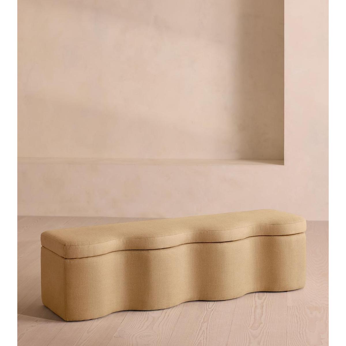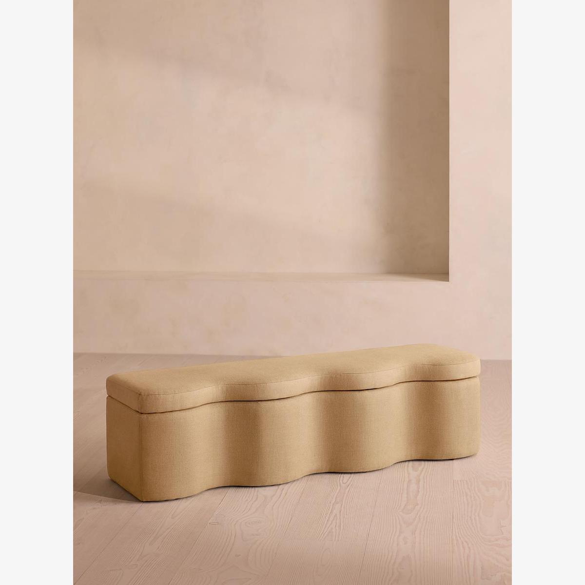 A hardwood frame creates a waved silhouette fitted with a hinged lid that doubles up as seating, thanks to the soft top. Designed to be placed at the foot of your bed, our Eli ottoman has a unique, wave-shaped silhouette crafted from wood and fully upholstered in velvet. Its hinged lid reveals internal storage space for blankets, shoes or clothing, while its bespoke palette is designed to match across our bedroom collection.