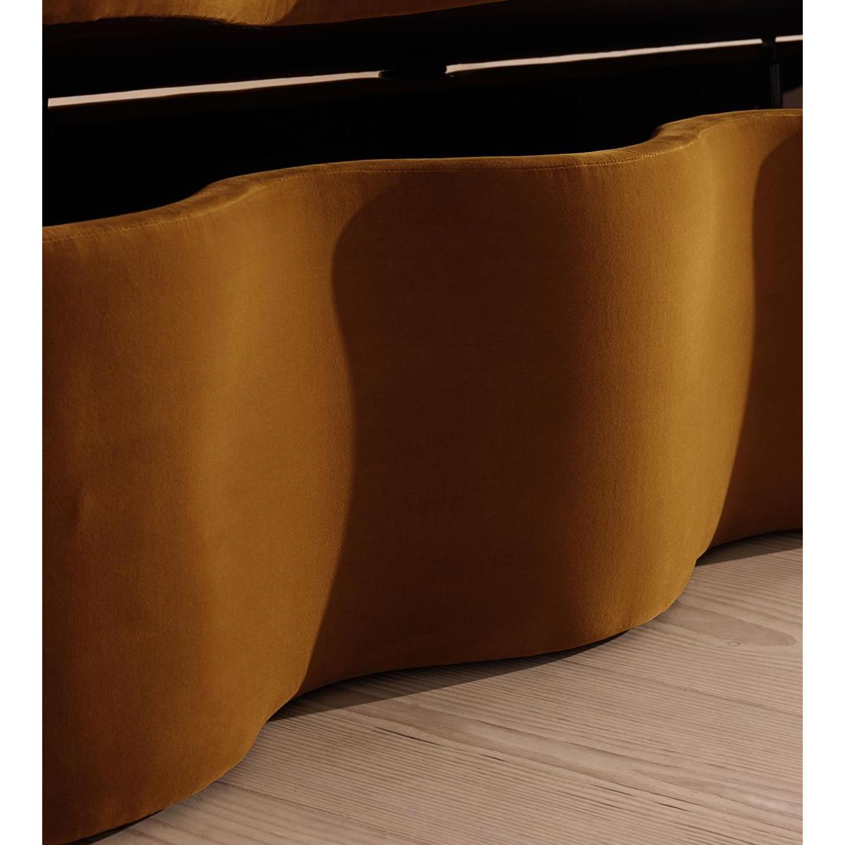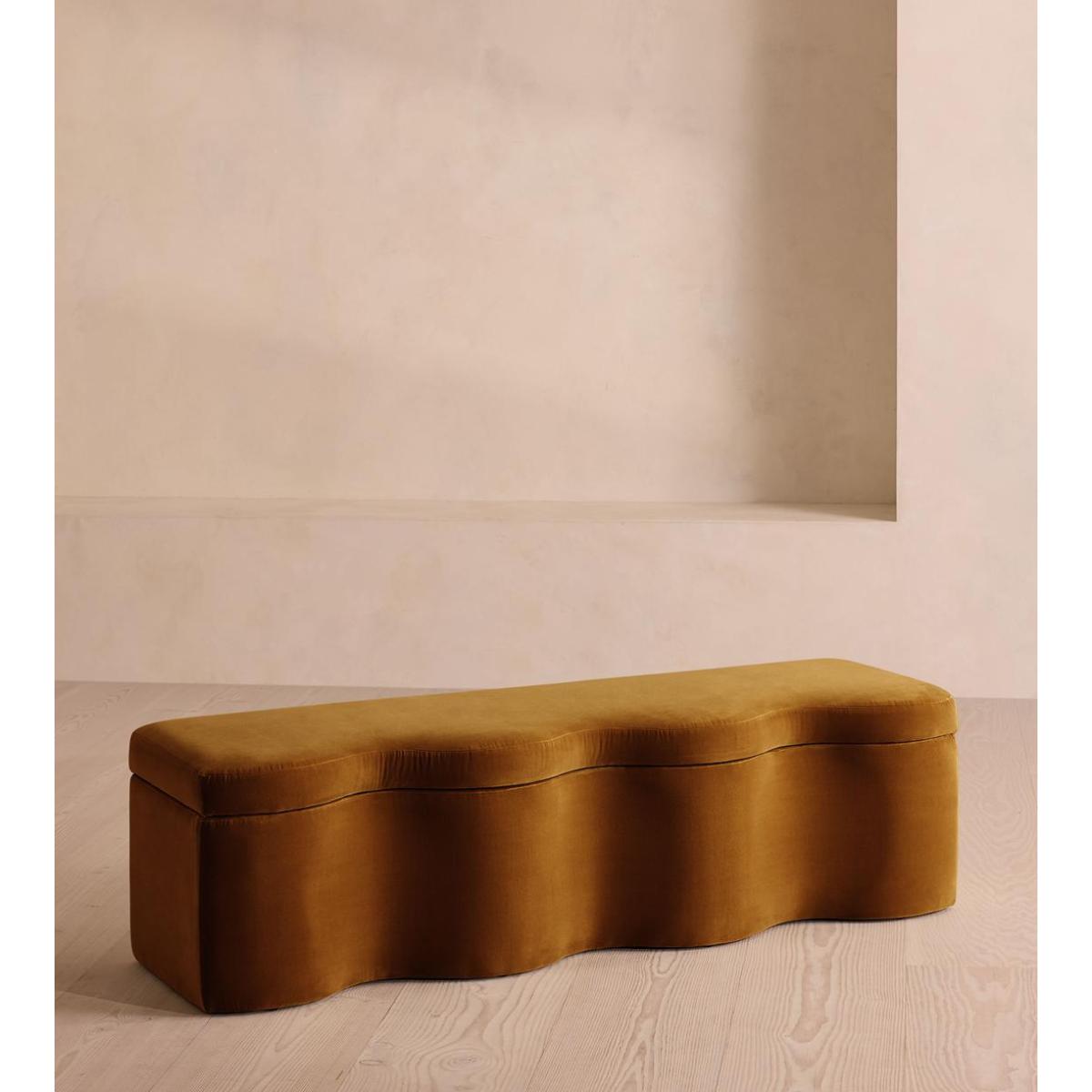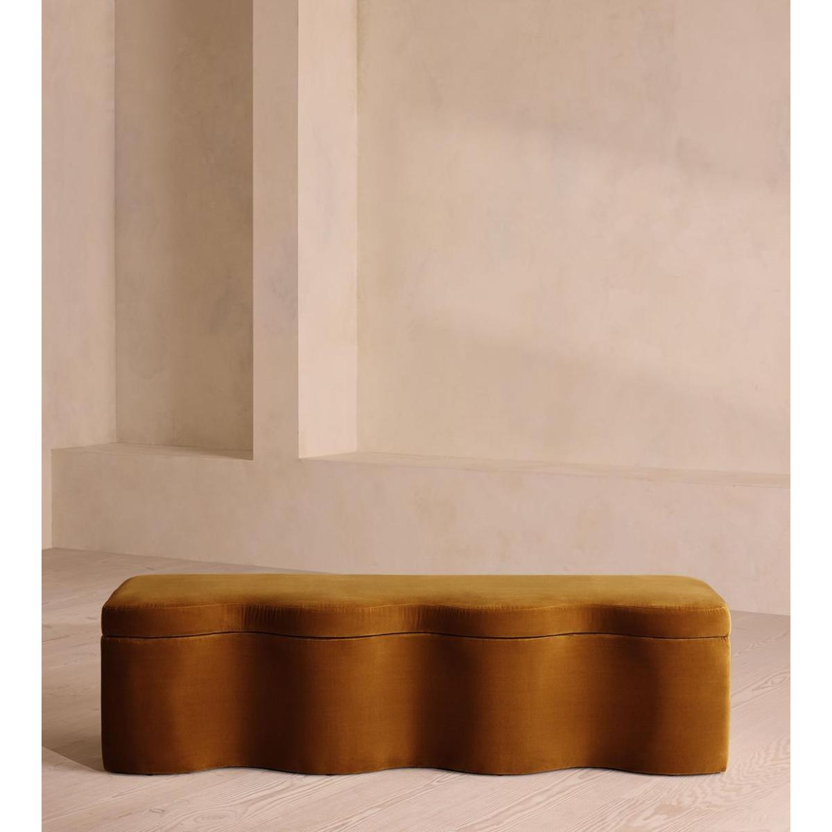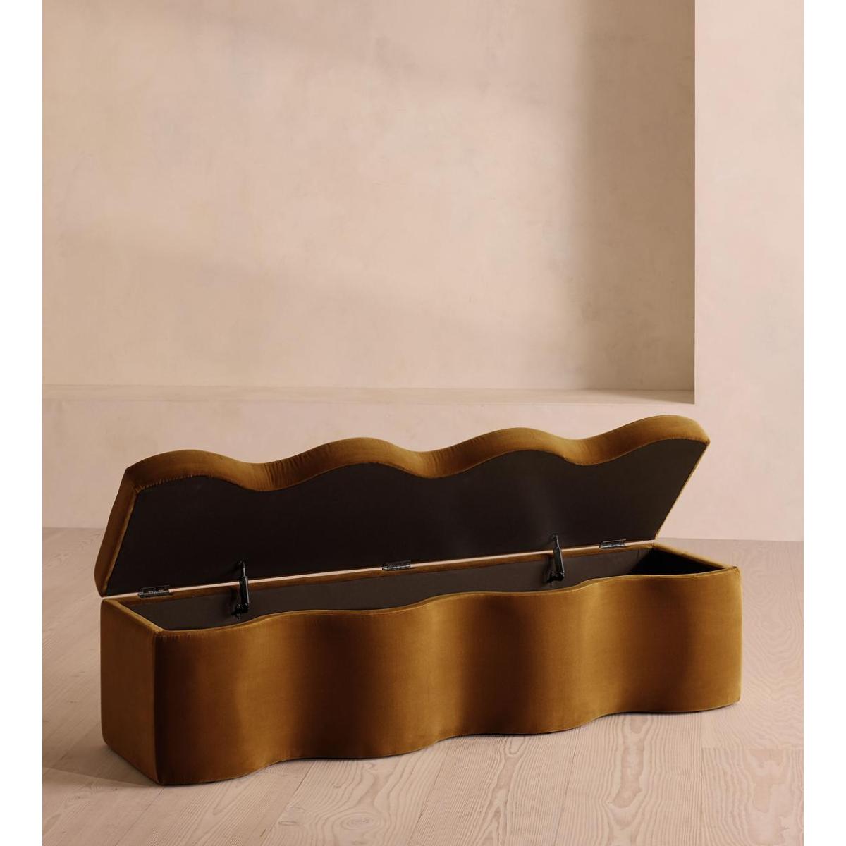 A hardwood frame creates a waved silhouette fitted with a hinged lid that doubles up as seating, thanks to the soft top. Designed to be placed at the foot of your bed, our Eli ottoman has a unique, wave-shaped silhouette crafted from wood and fully upholstered in velvet. Its hinged lid reveals internal storage space for blankets, shoes or clothing, while its bespoke palette is designed to match across our bedroom collection.