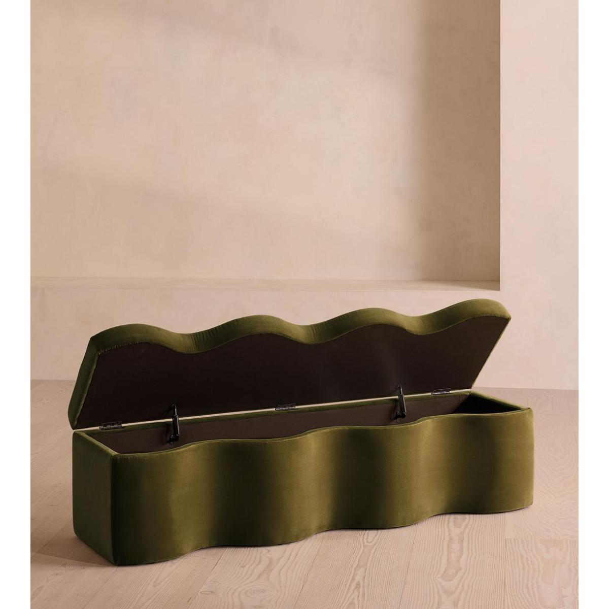 A hardwood frame creates a waved silhouette fitted with a hinged lid that doubles up as seating, thanks to the soft top. Designed to be placed at the foot of your bed, our Eli ottoman has a unique, wave-shaped silhouette crafted from wood and fully upholstered in velvet. Its hinged lid reveals internal storage space for blankets, shoes or clothing, while its bespoke palette is designed to match across our bedroom collection.