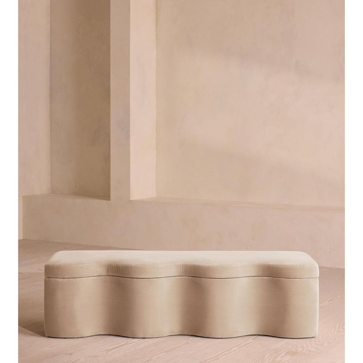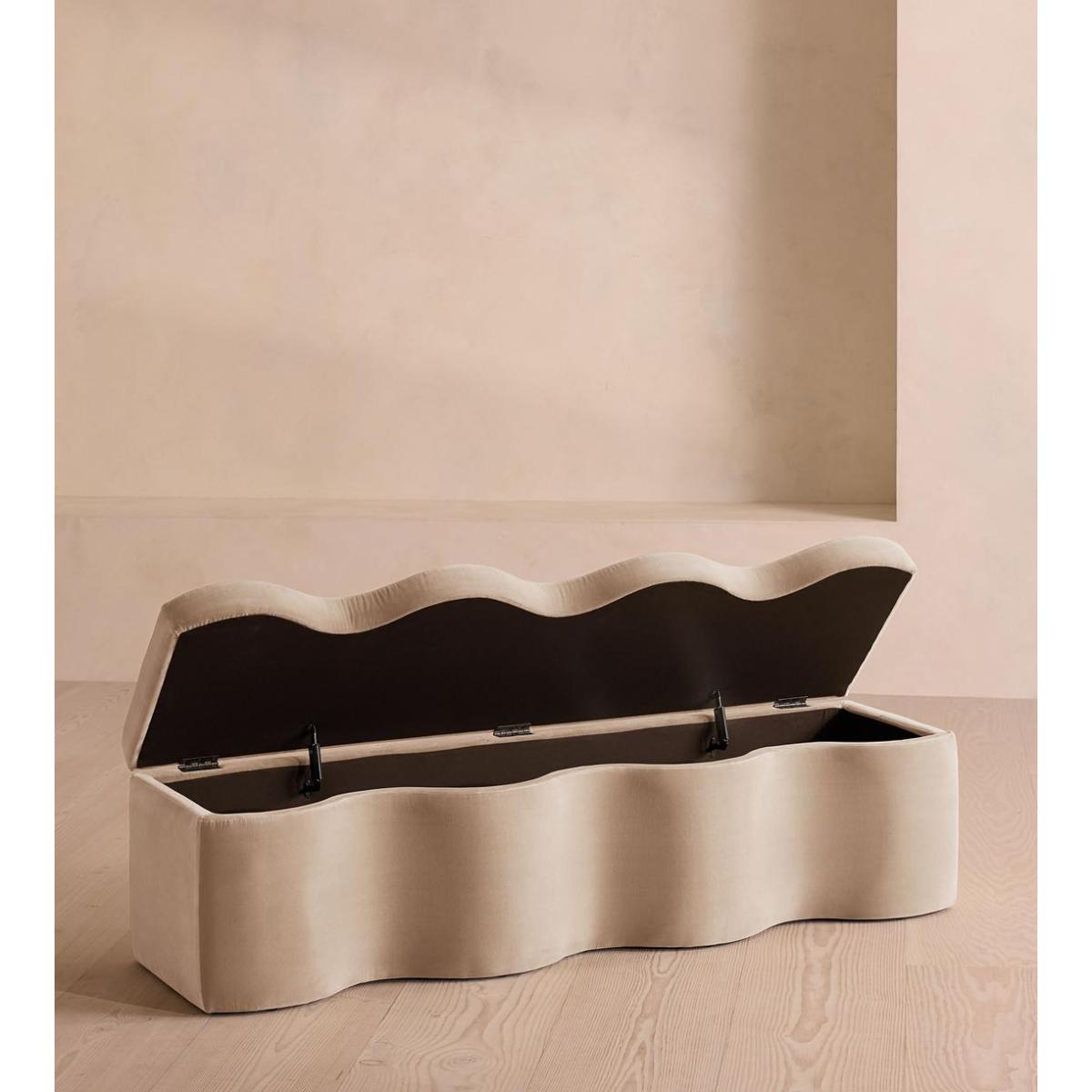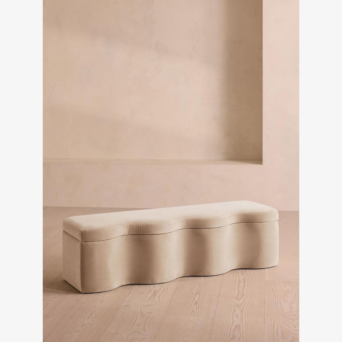 A hardwood frame creates a waved silhouette fitted with a hinged lid that doubles up as seating, thanks to the soft top. Designed to be placed at the foot of your bed, our Eli ottoman has a unique, wave-shaped silhouette crafted from wood and fully upholstered in velvet. Its hinged lid reveals internal storage space for blankets, shoes or clothing, while its bespoke palette is designed to match across our bedroom collection.