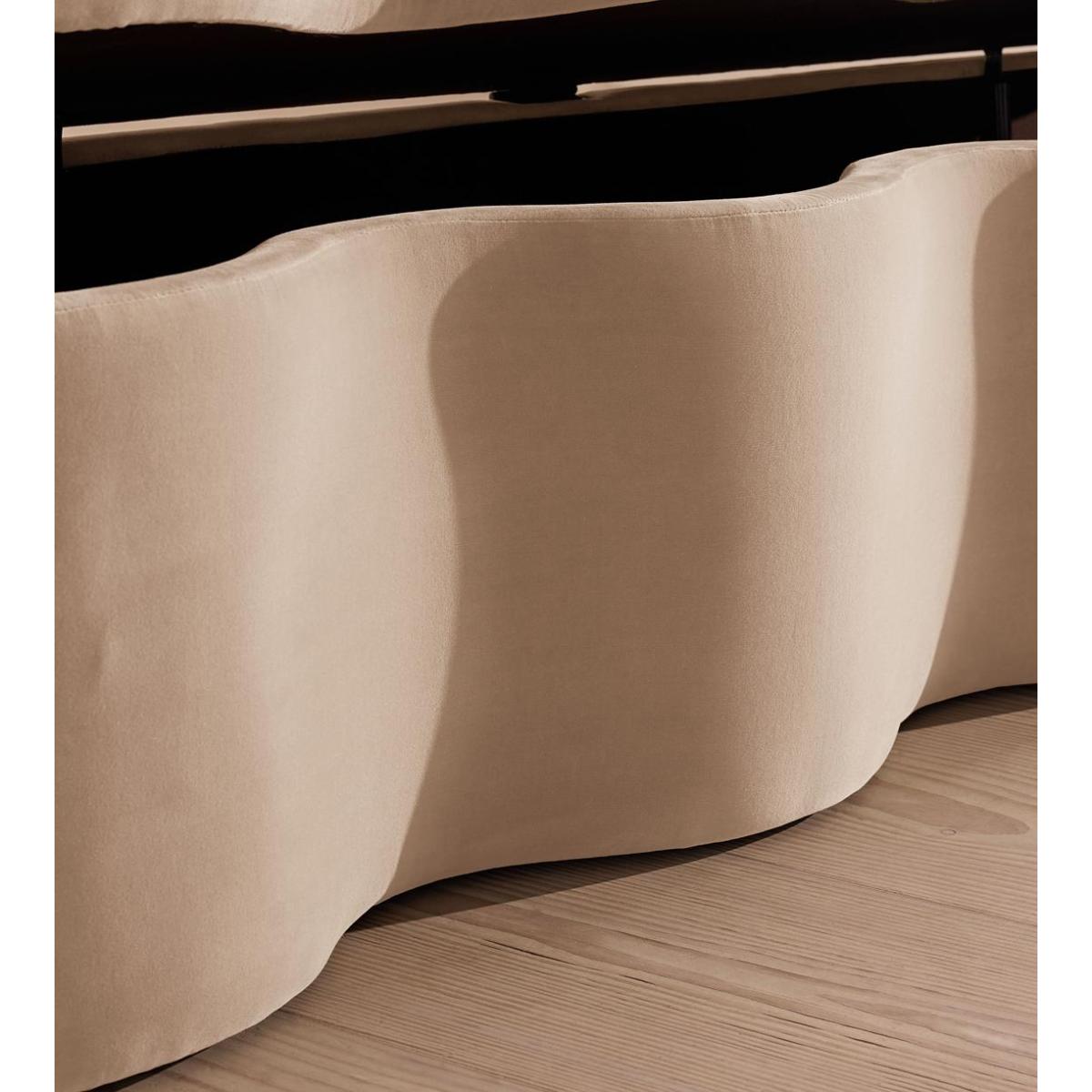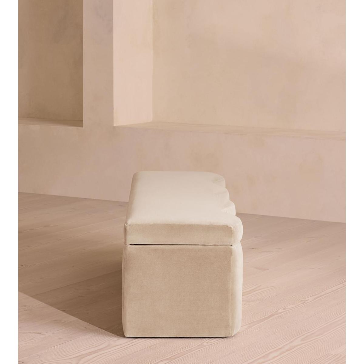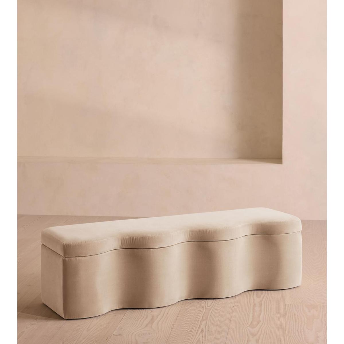 A hardwood frame creates a waved silhouette fitted with a hinged lid that doubles up as seating, thanks to the soft top. Designed to be placed at the foot of your bed, our Eli ottoman has a unique, wave-shaped silhouette crafted from wood and fully upholstered in velvet. Its hinged lid reveals internal storage space for blankets, shoes or clothing, while its bespoke palette is designed to match across our bedroom collection.