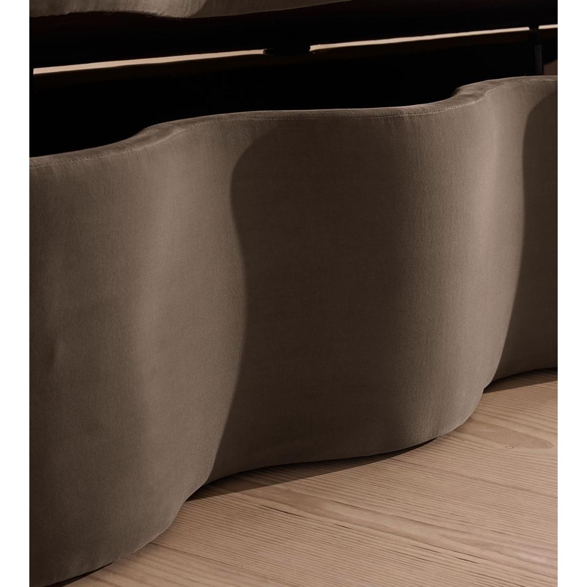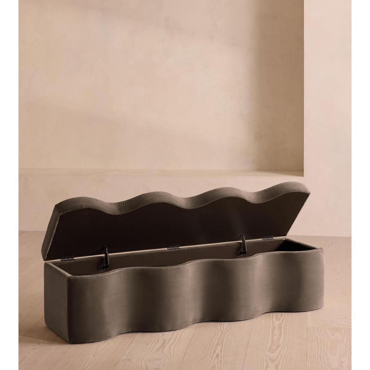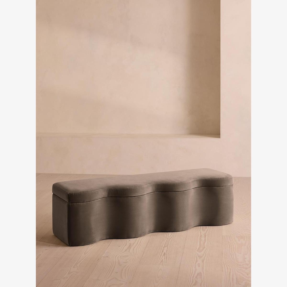 A hardwood frame creates a waved silhouette fitted with a hinged lid that doubles up as seating, thanks to the soft top. Designed to be placed at the foot of your bed, our Eli ottoman has a unique, wave-shaped silhouette crafted from wood and fully upholstered in velvet. Its hinged lid reveals internal storage space for blankets, shoes or clothing, while its bespoke palette is designed to match across our bedroom collection.