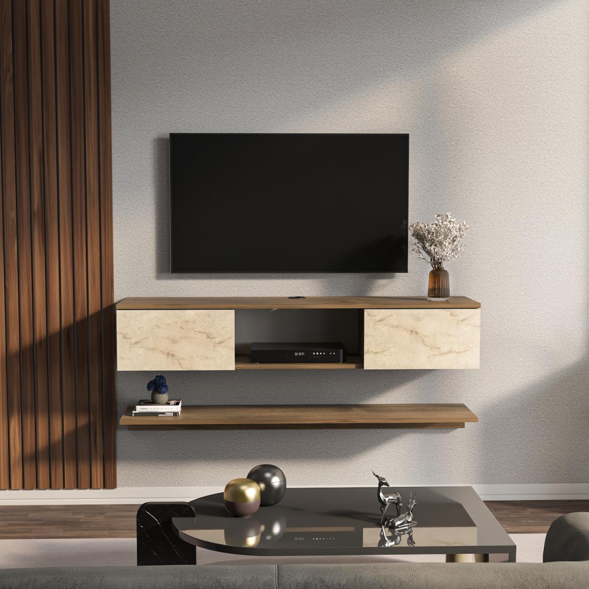 The stunning Elia Floating TV Unit! With its wall-mounted design, the Elia Floating TV Unit frees up more space in your living area. The downward-opening doors make storage effortless, while the central open shelf provides a perfect spot for your media devices. Thanks to its cable management feature, you can easily organize your cables and keep unsightly tangles out of sight. The package also includes a wall shelf, offering a stylish space to display your decorative items and cherished holiday memories. The media stand is made of 18 mm thick quality melamine coated particle board and banded with first-class PVC edge banding tape. The stand is also enhanced and strengthened with the solid wood leg which makes it sturdy and durable. It is manufactured using eco-friendly and health-friendly materials. The product will be delivered to the customer in the original package as disassembled. It is designed to be assembled by the customer easily using simple household tools like a power drill. Assembly instruction and installation hardware are included in the package. For fast and error-free installation, product parts are numbered with stickers in accordance with the assembly guide.