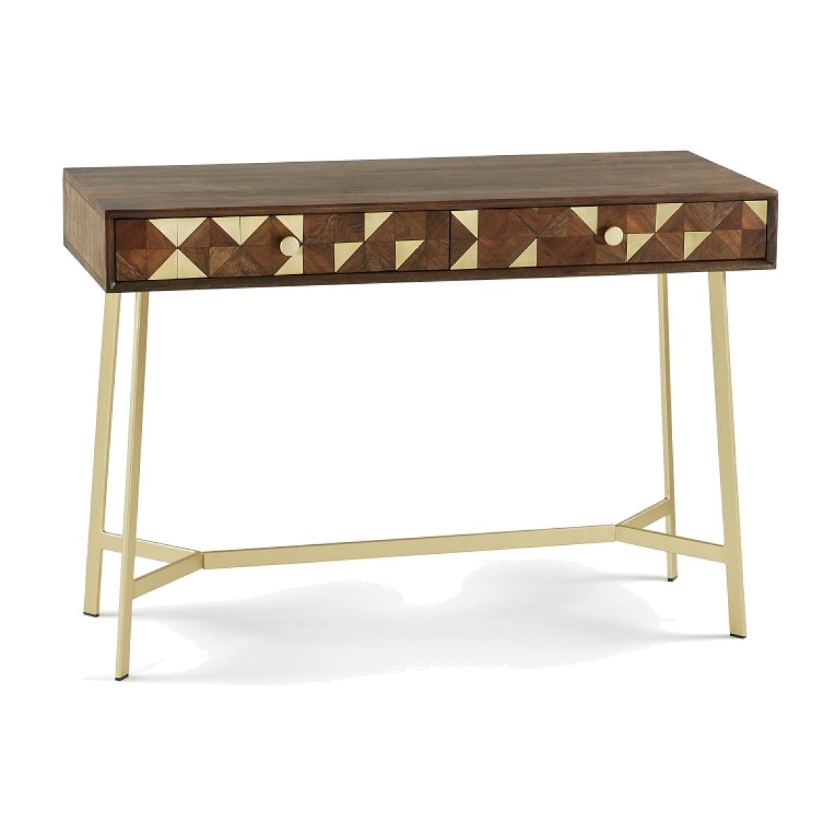 This beautiful console table combines exquisite style and design with brass inlaid into the rich Acacia wood. Geometric inspired sections and brushed brass finished legs complete the look of this stunning statement piece.