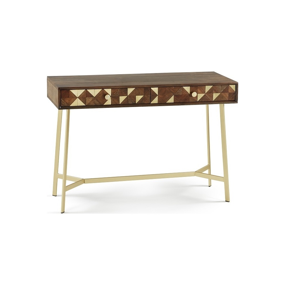 This beautiful console table combines exquisite style and design with brass inlaid into the rich Acacia wood. Geometric inspired sections and brushed brass finished legs complete the look of this stunning statement piece.