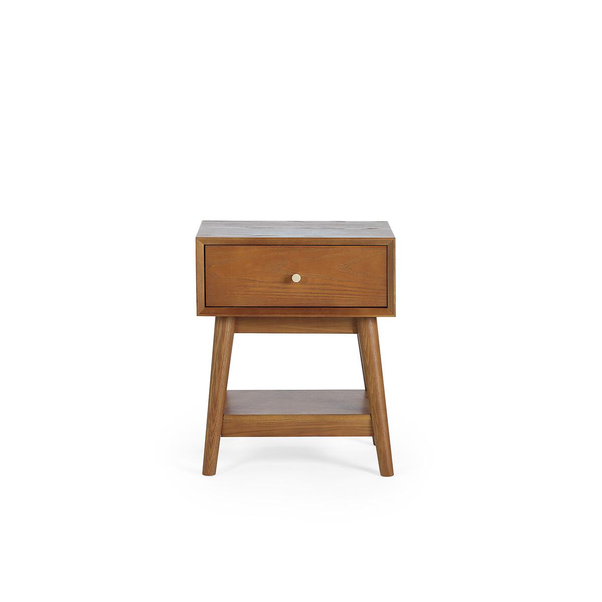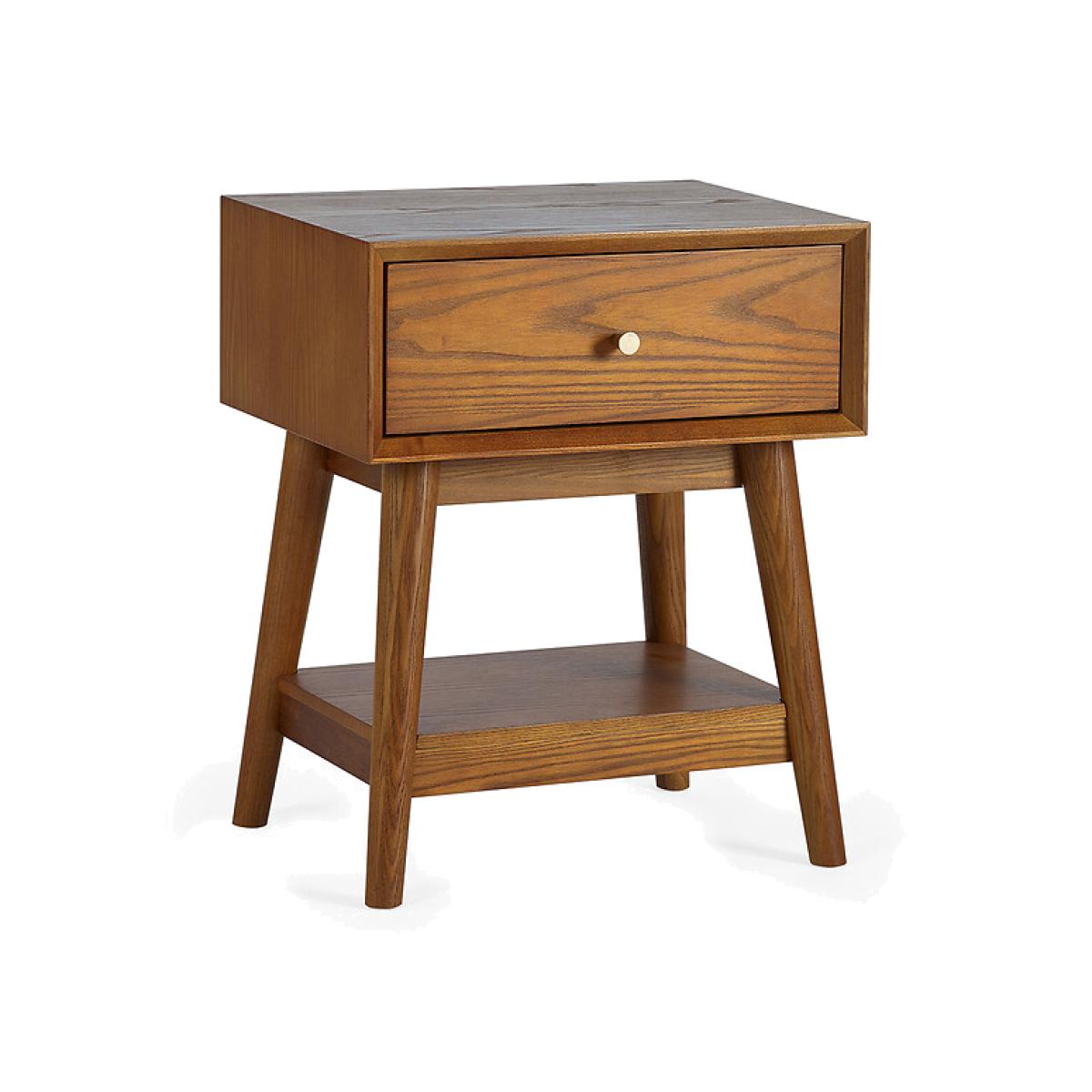 Recreate retro with the Elijah. A tawny-toned cherry ash wood veneer is beautifully complemented by tapered solid wood legs. Subtle gold knobs add a touch of luxe. The classic shape not only creates a striking focal point, but offers ample storage with an inbuilt drawer and shelf. Perfect as a side table in the living room, or bedside table in the bedroom. Product details • Cherry finished ash wood veneer with natural graining • Solid ash, ash veneer and MDF construction • Tapered legs • Gold finish drawer knobs • One drawer with metal slide opening • One shelf • Assembly required • Fixings supplied • 12 month manufacturer warranty. Product Composition - 80% Ash Wood, 10%Ash Veneer and 10%MDFProduct Dimensions - 33 cm x45 cm x45 cm , Weight - 12 KGPackage Dimensions - 55 cm x 44.5 cm x 35 cm, Weight 14 kg. Please note: this product cannot be be delivered to all Offshore Islands Northern Ireland or Republic of Ireland. This product will be dispatched by one of our trusted suppliers. You’ll be contacted by their selected courier about your delivery.