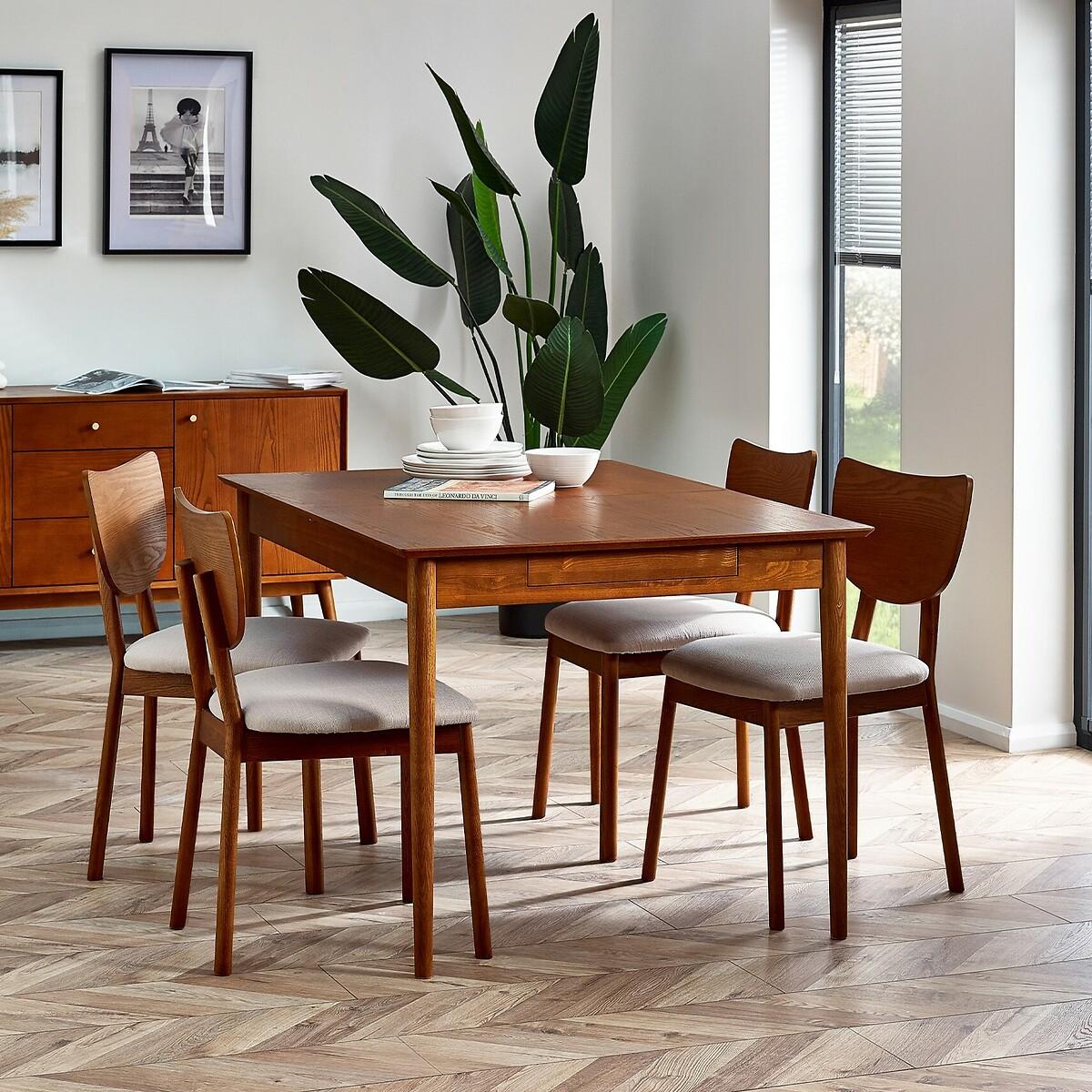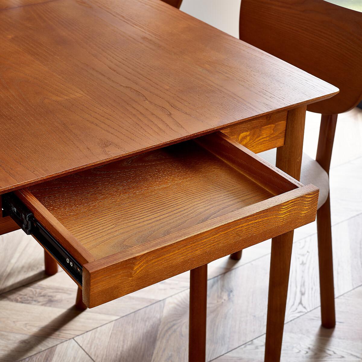 A gorgeous retro-inspired table which would integrate seamlessly in a mid-century modern dining room. The Elijah Extending Dining Table is constructed from an exquisite cherry ash wood veneer, complemented by beautifully slender legs to create an effortless look for any space. Two push-open drawers make it easy to quickly clear away laptops and homework come dinner time, or could be used for storing cutlery. A clever butterfly extension system makes it easy to accomodate extra guests at dinner parties. Product details • Seats 4 unextended, seats 6 extended • Butterfly extending dining table • Extension leaf stores easily within the table when not in use • Cherry ash wood veneer • Two storage drawers (push to open) • Slender rounded legs •Rectangular shape with curved corners • Bevelled table edge • Assembly required • Fixings supplied • 12 month manufactuers warranty. Product Composition - 80% Ash Wood, 10% Ash Veneer And 10%Mdf. Product Dimensions - 90 cm x 180 cm x 78 cm , Weight - 39 KGPackage Dimensions - 152 cm x 101 cm x 21 cm, Weight 45 kg. Please note: this product cannot be be delivered to all Offshore Islands Northern Ireland or Republic of Ireland. This product will be dispatched by one of our trusted suppliers. You’ll be contacted by their selected courier about your delivery.
