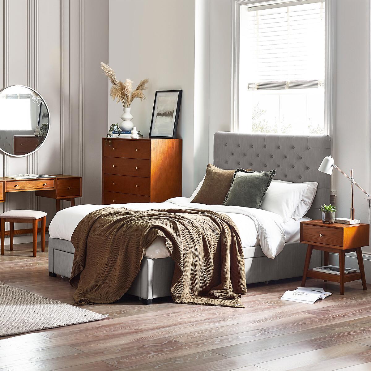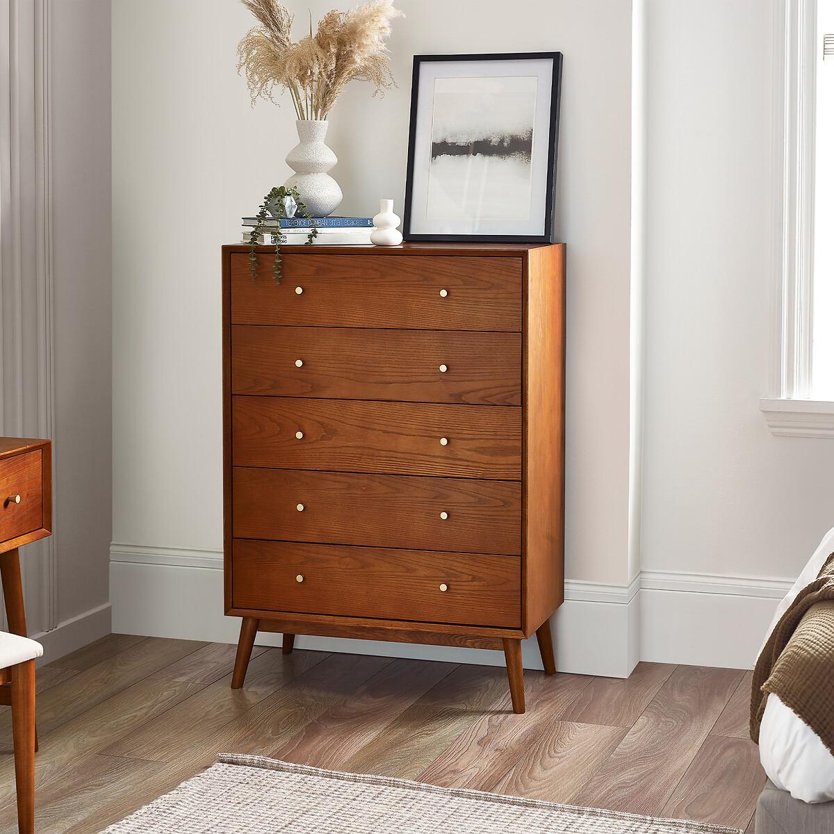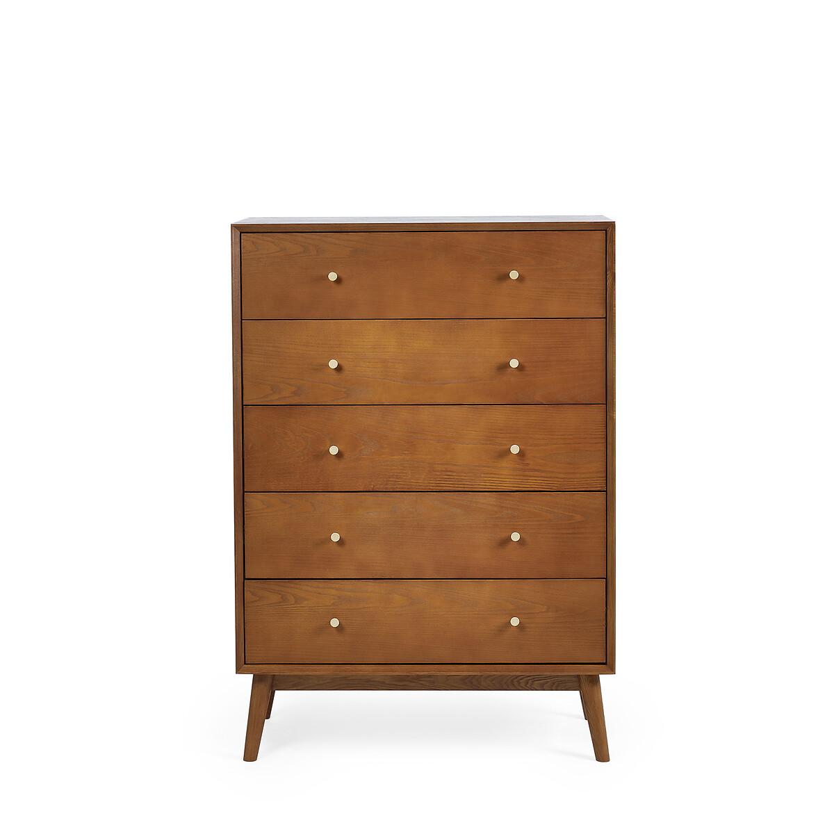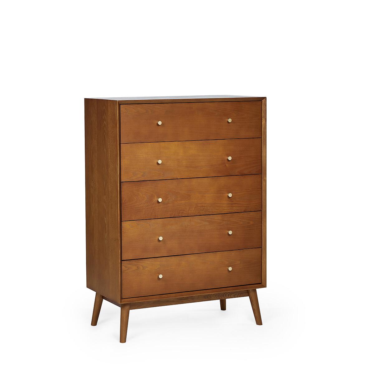 Recreate retro with the Elijah. A tawny-toned cherry ash wood veneer is beautifully complemented by tapered solid wood legs. Subtle gold knobs add a touch of luxe. The classic shape not only creates a striking focal point, but offers ample storage. Features: • Cherry ash wood veneer - smooth, strong and durable • Natural wood grain • 5 drawers • Tapered legs • Gold coloured handles • Assembly required • Fixings supplied • 12 month manufacturers warranty. Product Composition - 80% Ash Wood, 10%Ash Veneer and 10%MDFProduct Dimensions - 84 cm x 44 cm x 120 cm , Weight - 54.5 KGPackage Dimensions - 113.5 cm x 93 cm x 54 cm, Weight 65 kg. Please note: this product cannot be be delivered to all Offshore Islands Northern Ireland or Republic of Ireland. This product will be dispatched by one of our trusted suppliers. You’ll be contacted by their selected courier about your delivery.