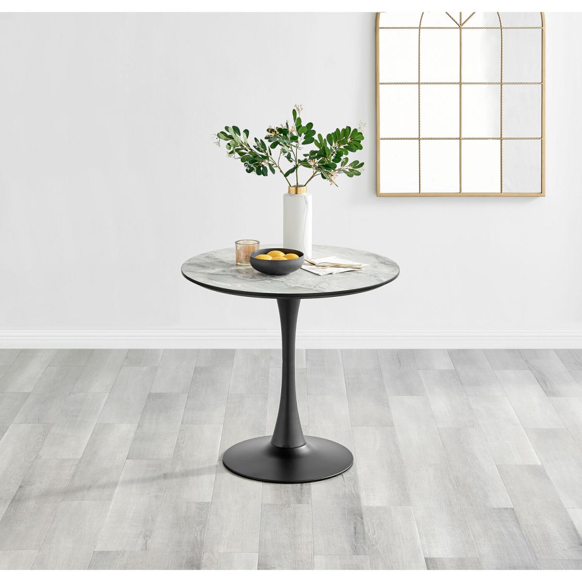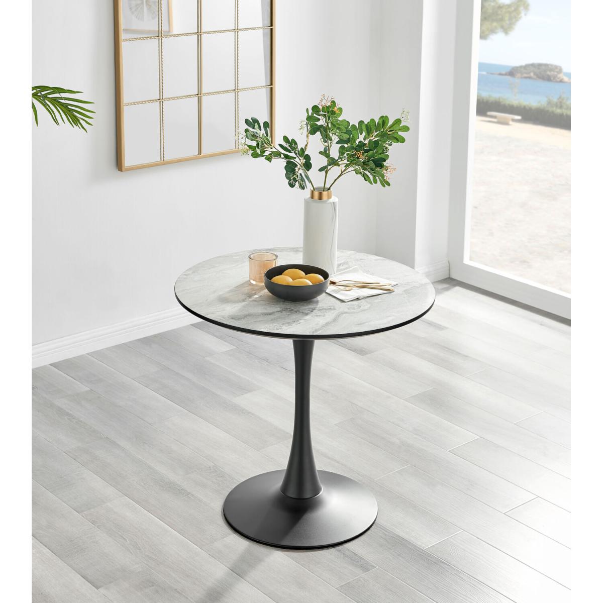 The Elina round marble-effect dining table is a statement piece for the interiors connoisseur. It oozes luxury and opulence. Featuring an 80cm x 80cm round tabletop made from marble effect veneer (which is right on trend and easy to maintain), it's a compact 2 seater dining table perfect for smaller spaces and more relaxed intimate dining. Sitting on a single curved pedestal leg in black powder-coated metal. A sleek, stylish dining table with minimalist industrial vibes. This beautifully designed dining table will set the scene for a stylish and luxurious room. Want to complete the look Shop our stylish dining chair range for ultimate ergonomic comfort.