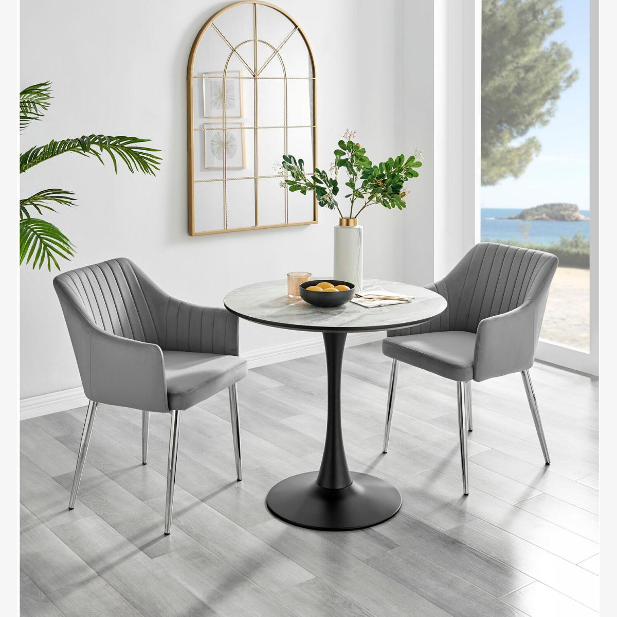 The Elina round marble-effect dining table is a statement piece for the interiors connoisseur. It oozes luxury and opulence. Featuring an 80cm x 80cm round tabletop made from marble effect veneer (which is right on trend and easy to maintain), it's a compact 2 seater dining table perfect for smaller spaces and more relaxed intimate dining. Sitting on a single curved pedestal leg in black powder-coated metal. A sleek, stylish dining table with minimalist industrial vibes. This beautifully designed dining table will set the scene for a stylish and luxurious room. Want to complete the look Shop our stylish dining chair range for ultimate ergonomic comfort.