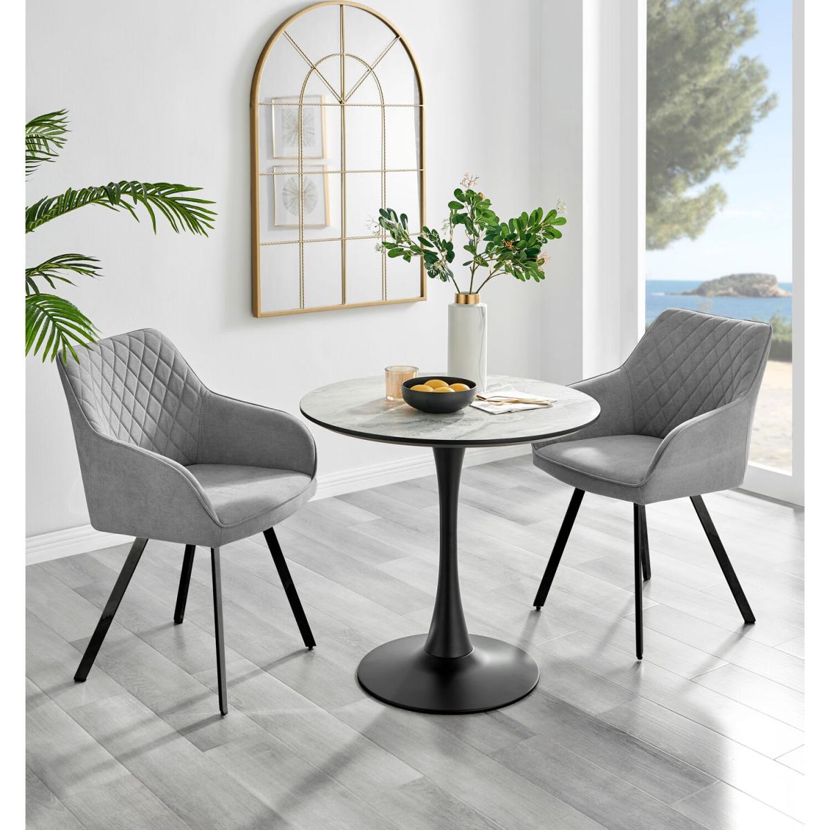The Elina round marble-effect dining table is a statement piece for the interiors connoisseur. It oozes luxury and opulence. Featuring an 80cm x 80cm round tabletop made from marble effect veneer (which is right on trend and easy to maintain), it's a compact 2 seater dining table perfect for smaller spaces and more relaxed intimate dining. Sitting on a single curved pedestal leg in black powder-coated metal. A sleek, stylish dining table with minimalist industrial vibes. This beautifully designed dining table will set the scene for a stylish and luxurious room. Want to complete the look Shop our stylish dining chair range for ultimate ergonomic comfort.