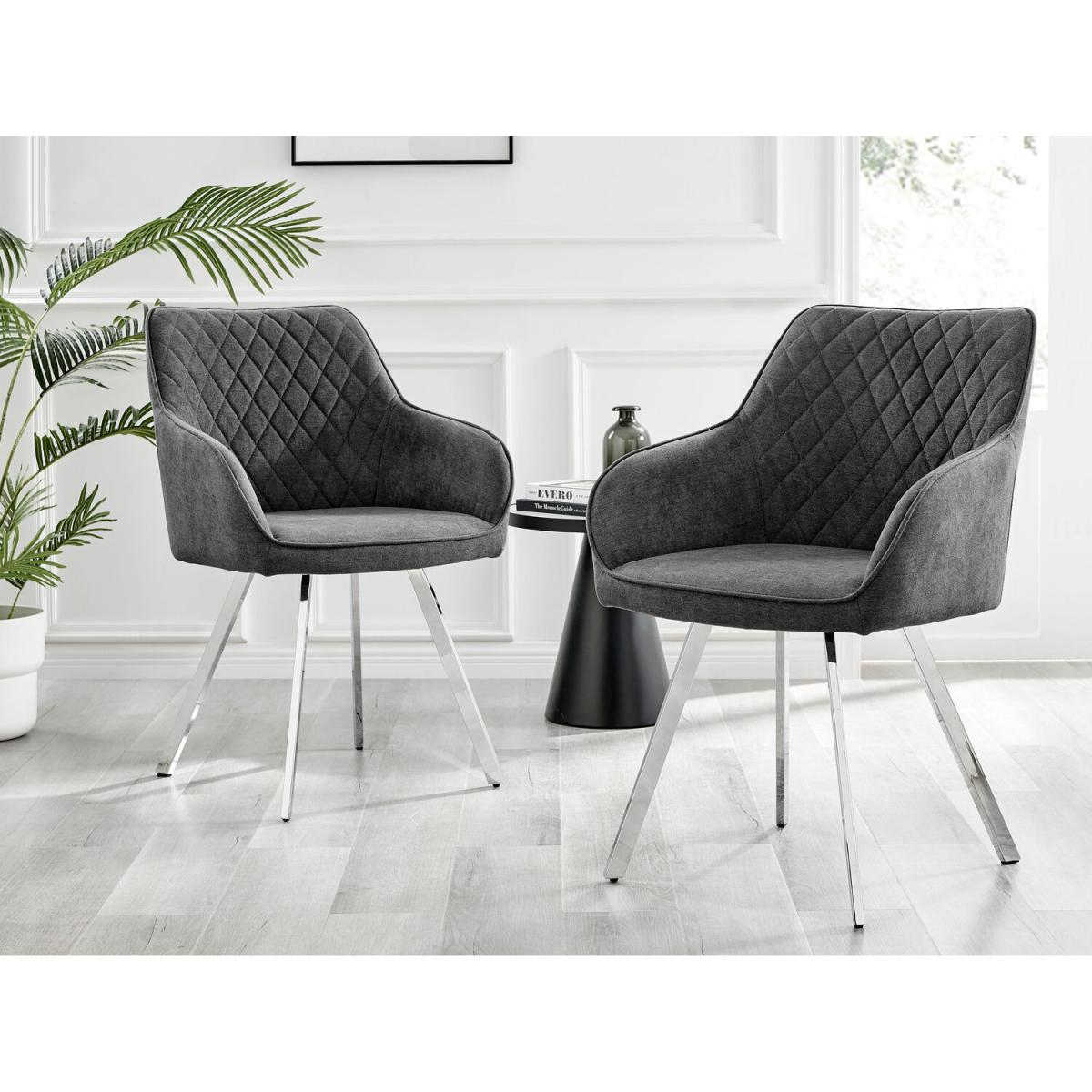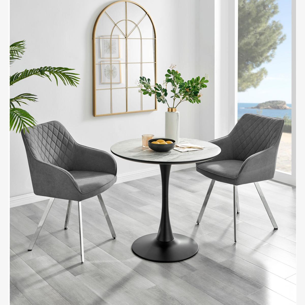 The Elina round marble-effect dining table is a statement piece for the interiors connoisseur. It oozes luxury and opulence. Featuring an 80cm x 80cm round tabletop made from marble effect veneer (which is right on trend and easy to maintain), it's a compact 2 seater dining table perfect for smaller spaces and more relaxed intimate dining. Sitting on a single curved pedestal leg in black powder-coated metal. A sleek, stylish dining table with minimalist industrial vibes. This beautifully designed dining table will set the scene for a stylish and luxurious room. Want to complete the look Shop our stylish dining chair range for ultimate ergonomic comfort.