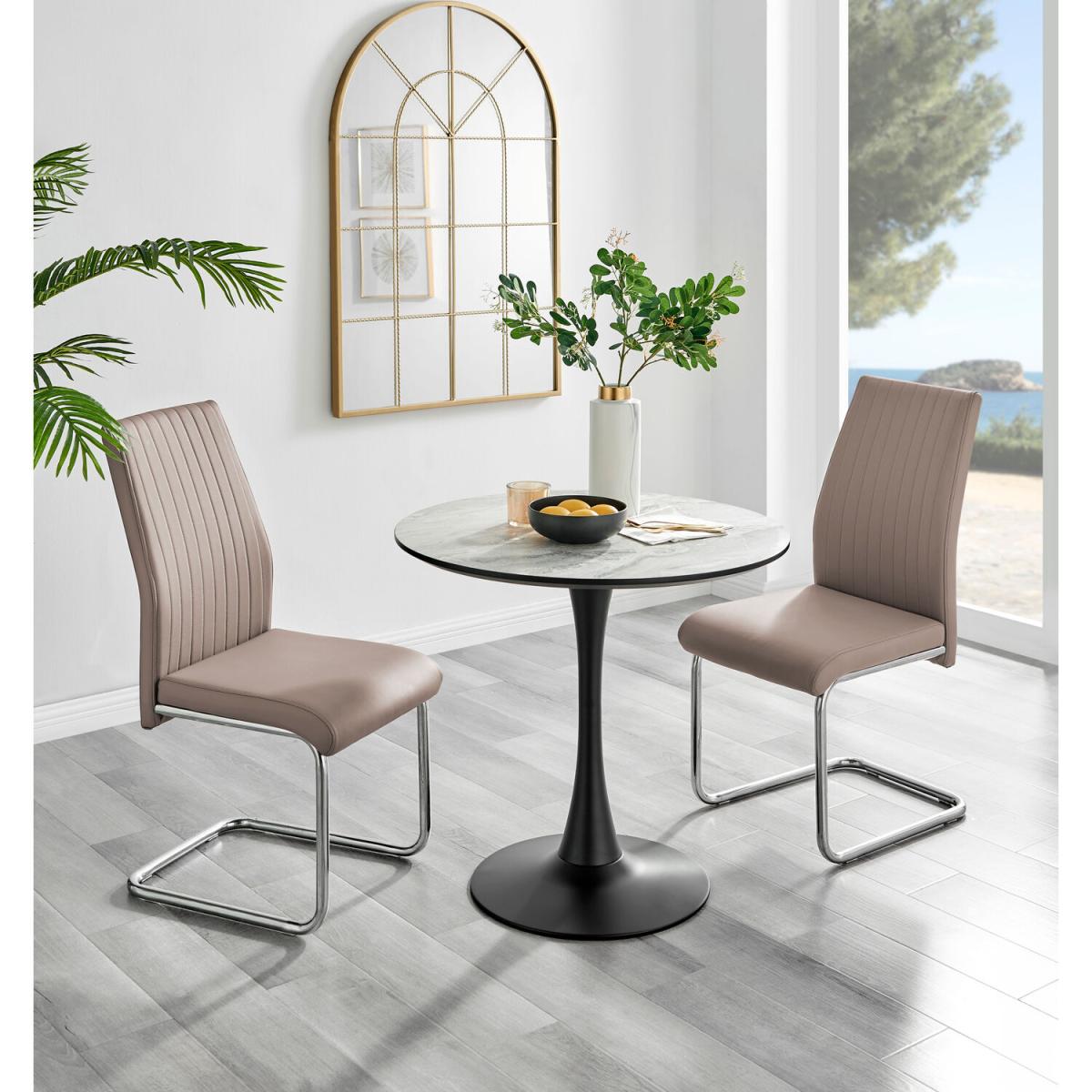 The Elina round marble-effect dining table is a statement piece for the interiors connoisseur. It oozes luxury and opulence. Featuring an 80cm x 80cm round tabletop made from marble effect veneer (which is right on trend and easy to maintain), it's a compact 2 seater dining table perfect for smaller spaces and more relaxed intimate dining. Sitting on a single curved pedestal leg in black powder-coated metal. A sleek, stylish dining table with minimalist industrial vibes. This beautifully designed dining table will set the scene for a stylish and luxurious room. Want to complete the look Shop our stylish dining chair range for ultimate ergonomic comfort.
