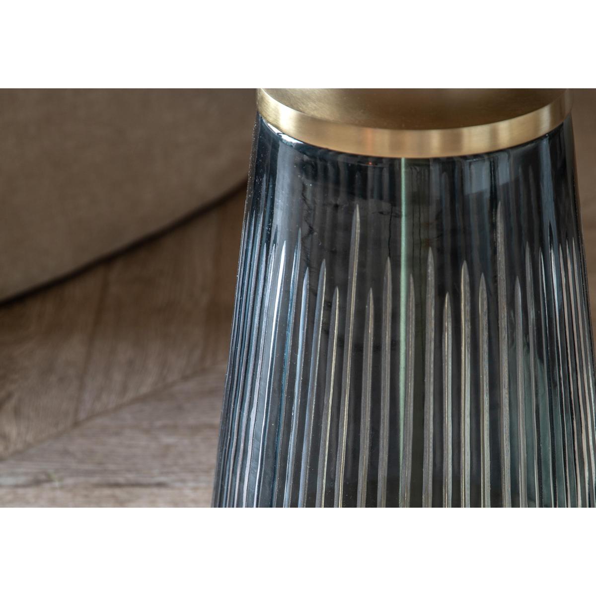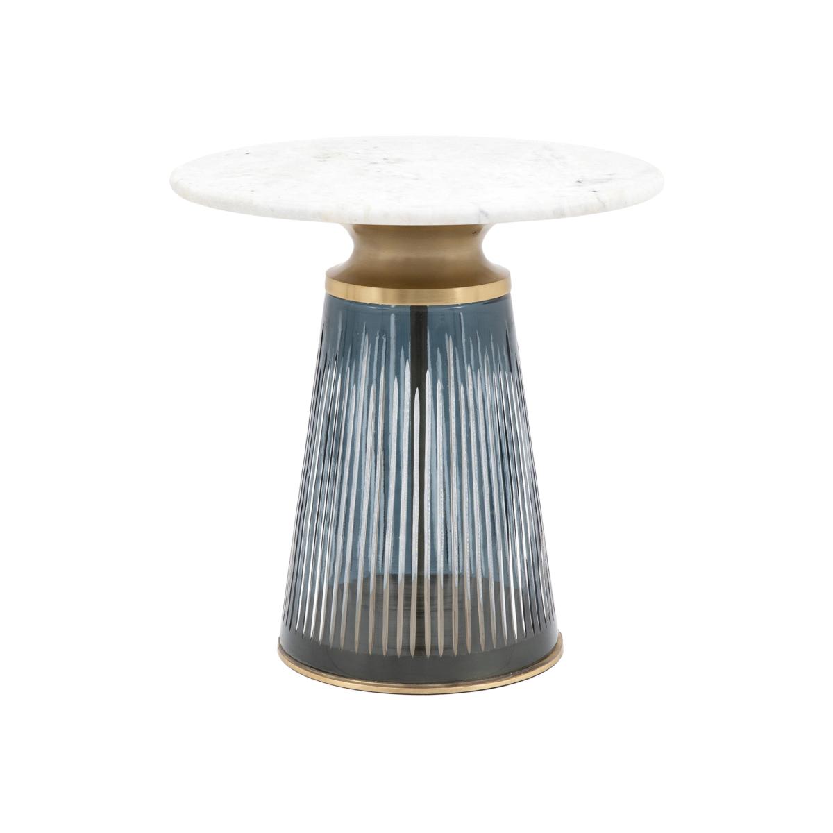 This side table is so unusual. A stunning arrangement of shape and texture – the tapered fluted base is made of glass, and the round top is solid white marble – it’s both stylish and elegant. Why you'll love it Marble and glass side table is inspired by Art Deco style. Smooth round top made of white marble. Tapered glass base has vertical fluting. In a choice of colours for the base. This marble and glass side table is part of our occasional table collection. What you need to know Marble top. Glass base. Always use coasters and placemats on stone and marble surfaces to protect against heat, spills and ring marks. Remove spills immediately to minimise staining. This is especially important with acidic substances like fruit juice, wine and curry. To clean, wipe with a damp cloth and then dry using a soft duster. Avoid abrasive cleaning products. For indoor use only. Item code: ELIOSTBLBLUE-001