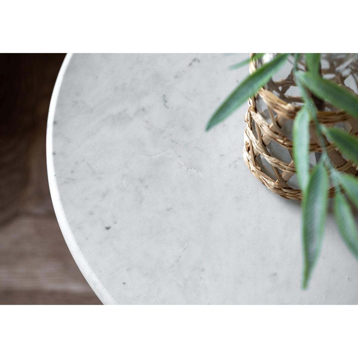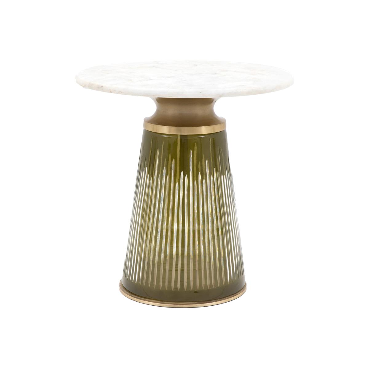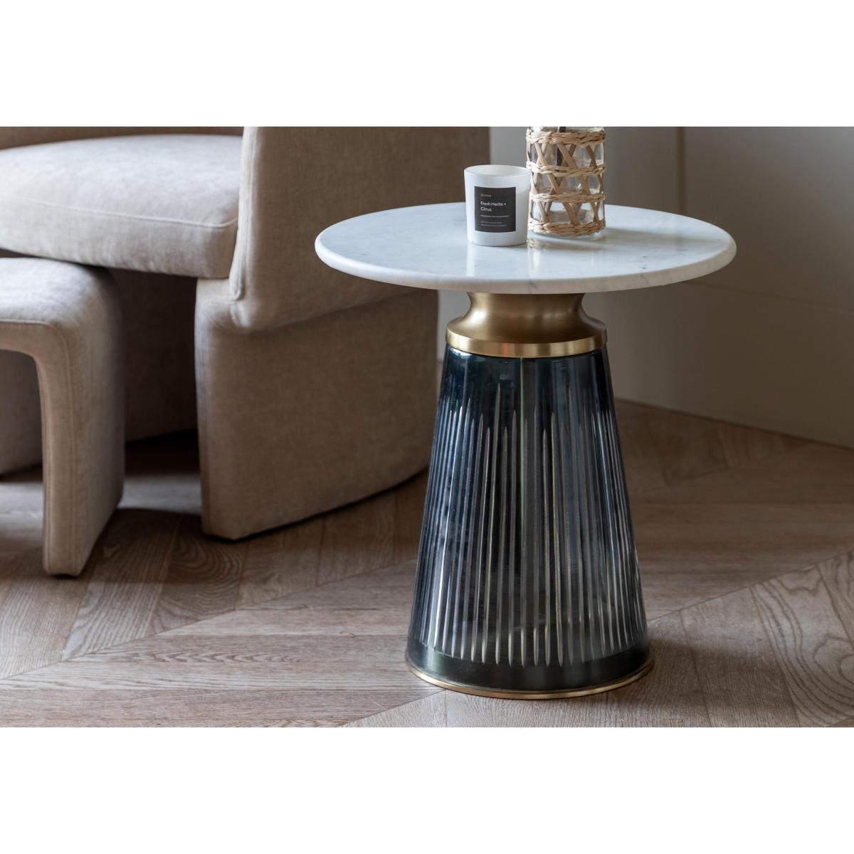 This side table is so unusual. A stunning arrangement of shape and texture – the tapered fluted base is made of glass, and the round top is solid white marble – it’s both stylish and elegant. Why you'll love it Marble and glass side table is inspired by Art Deco style. Smooth round top made of white marble. Tapered glass base has vertical fluting. In a choice of colours for the base. This marble and glass side table is part of our occasional table collection. What you need to know Marble top. Glass base. Always use coasters and placemats on stone and marble surfaces to protect against heat, spills and ring marks. Remove spills immediately to minimise staining. This is especially important with acidic substances like fruit juice, wine and curry. To clean, wipe with a damp cloth and then dry using a soft duster. Avoid abrasive cleaning products. For indoor use only. Item code: ELIOSTBLDUSK-001